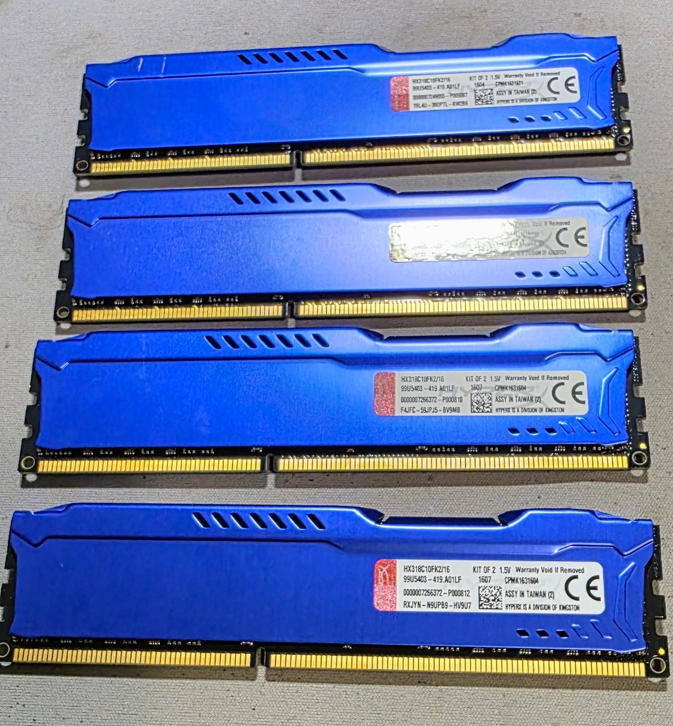 I am selling used in excellent working condition a matched 32gb kit (8gbx4) Kingston Fury HpyerX high performance ddr3 memory for $165. This 32gb kit is 1866mhz pc3 14900 desk top pc's