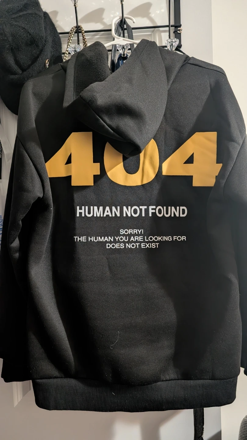 Buy & SellBlack "404 Human Not Found" HoodieBlack "404 Human Not Found" Hoodie$12Black hoodie with "404 Human Not Found" graphic on the back. Features a front pouch pocket and a hood. ConditionLike newSizeLarge WHERE TO MEETFowley parkView MapSELLERverifiedKanojoPost Rd781 review0 chats·0 favorites·10 viewsSEND CHAT TO SELLERHi Kanojo! I’m interested in your listing.Hi Kanojo! I’m interested in your listing.Get the Karrot app to chatSign In to chat
