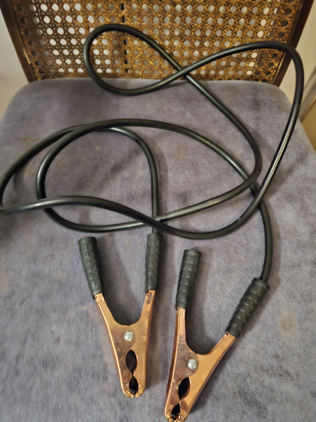 These are two sets of jumper cables, one black and one red. Each set features sturdy copper clamps for a reliable connection. They're handy to have in case of a dead battery!