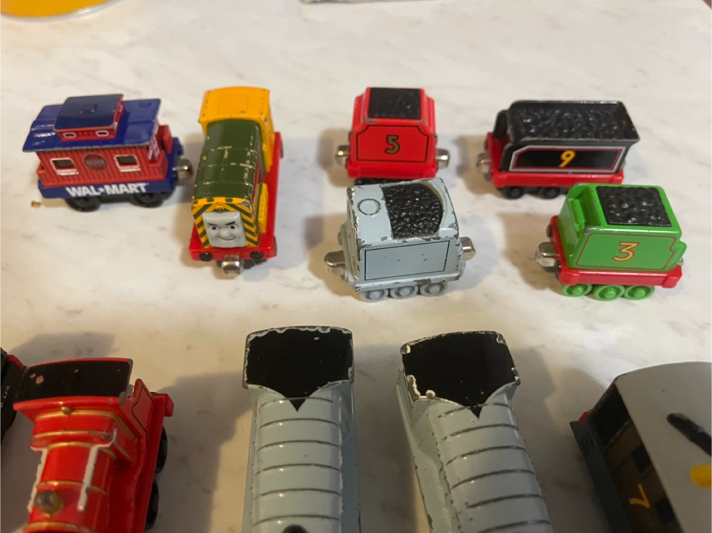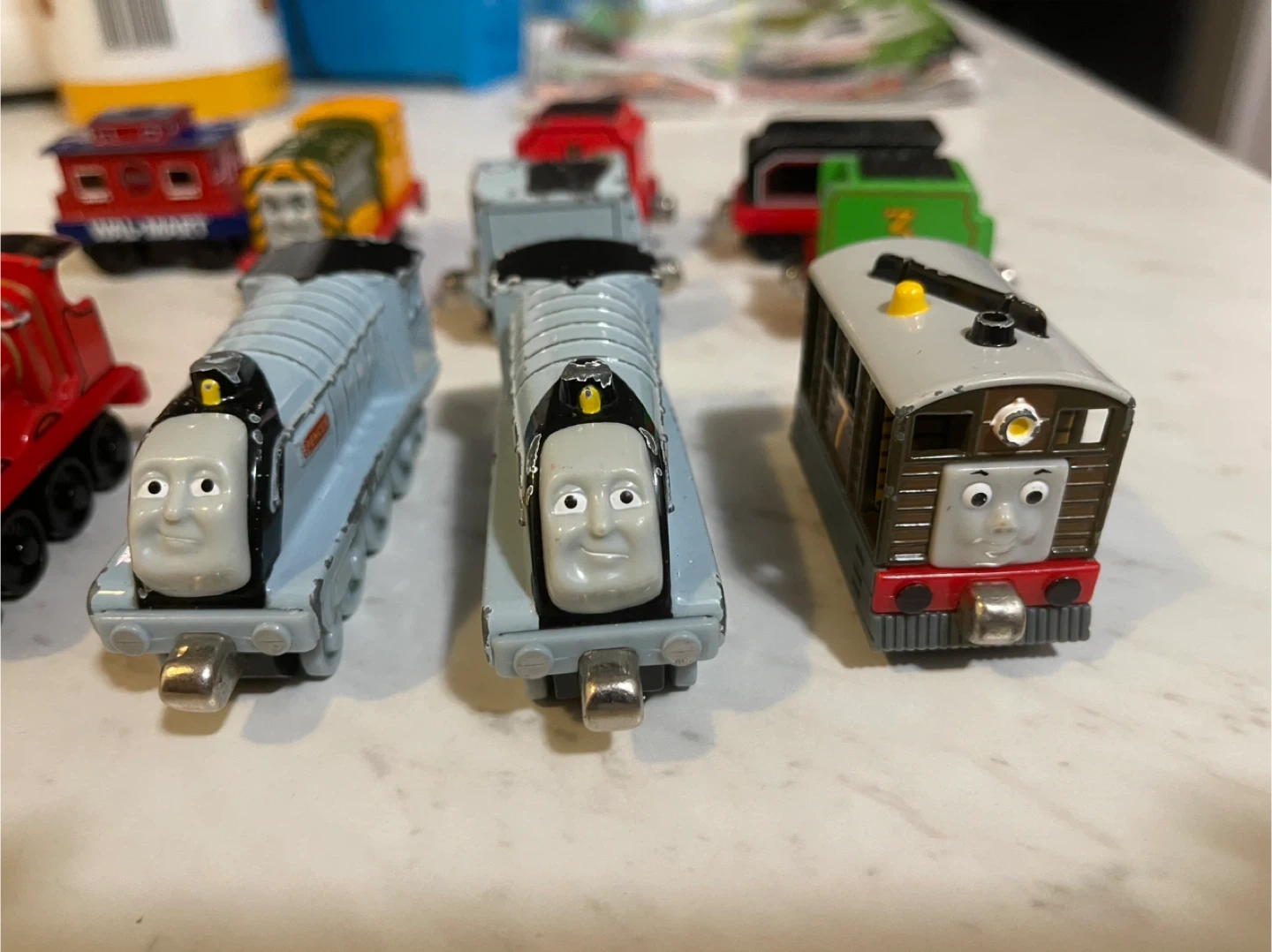 A collection of various Thomas & Friends die-cast metal trains. Includes characters like Spencer, Gordon, Toby, Salty, James, and others. Great for collectors or playtime!