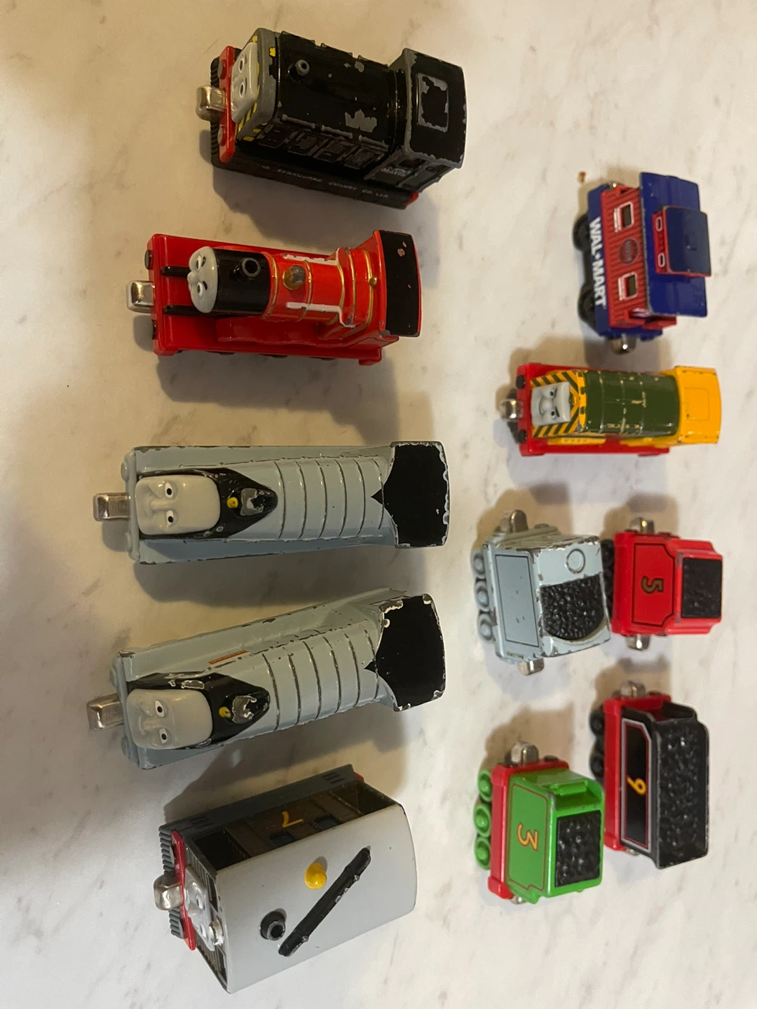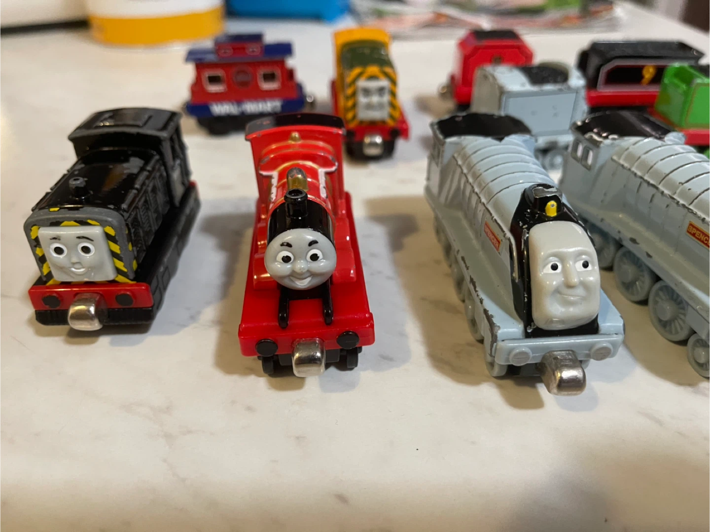A collection of various Thomas & Friends die-cast metal trains. Includes characters like Spencer, Gordon, Toby, Salty, James, and others. Great for collectors or playtime!