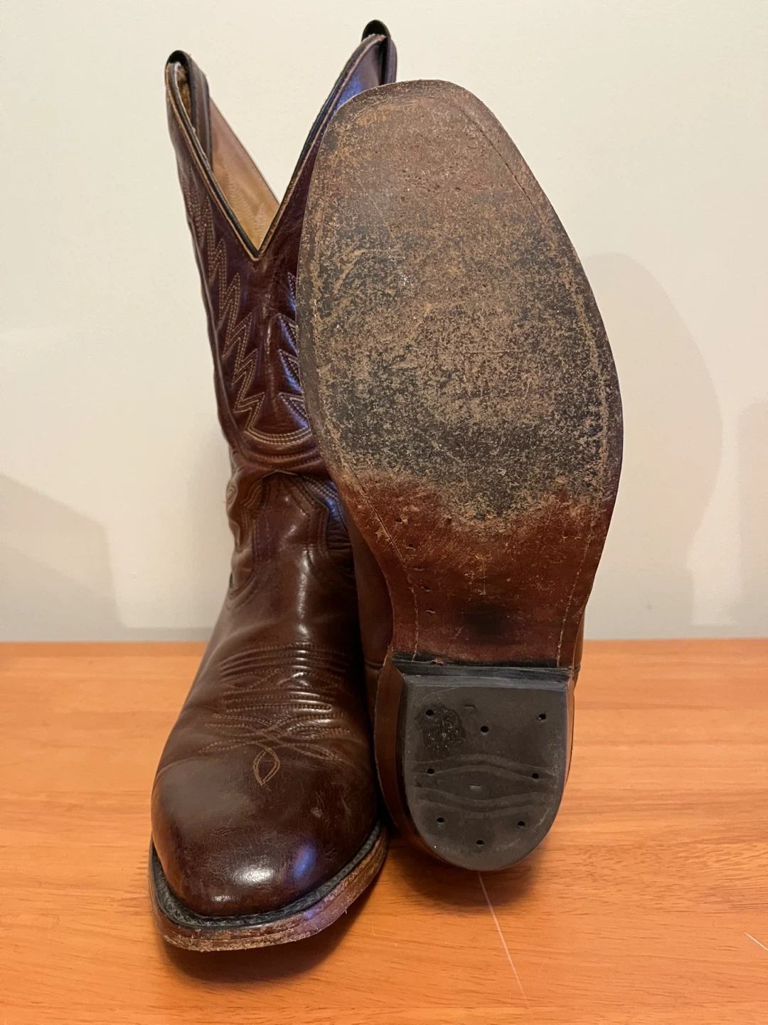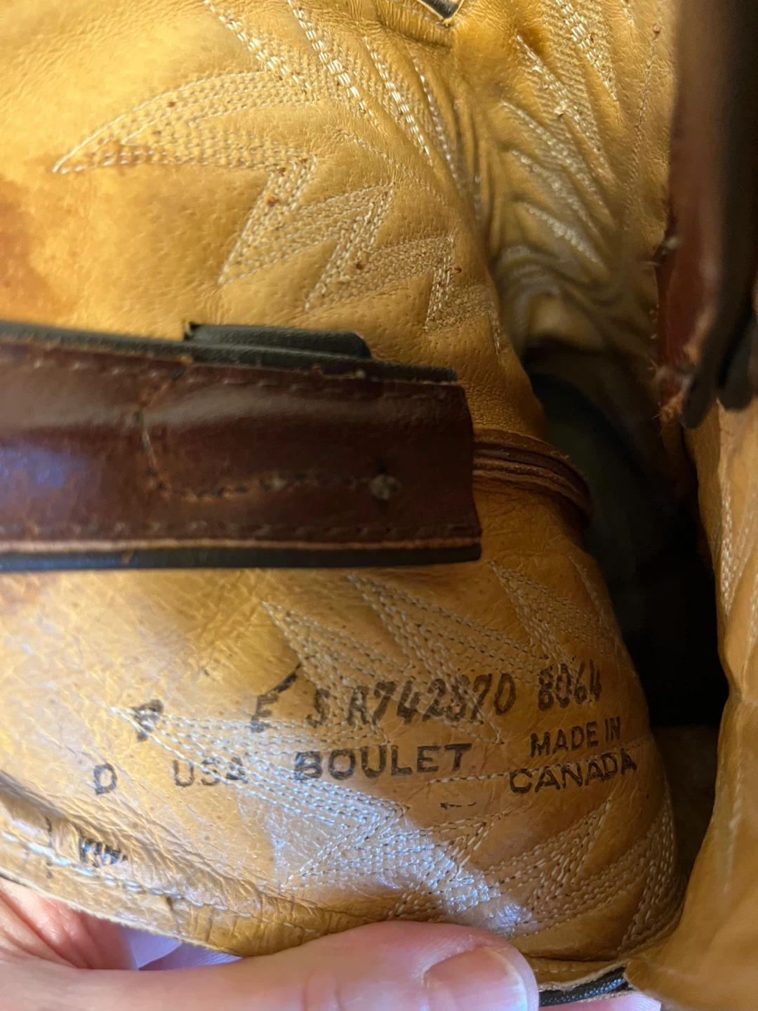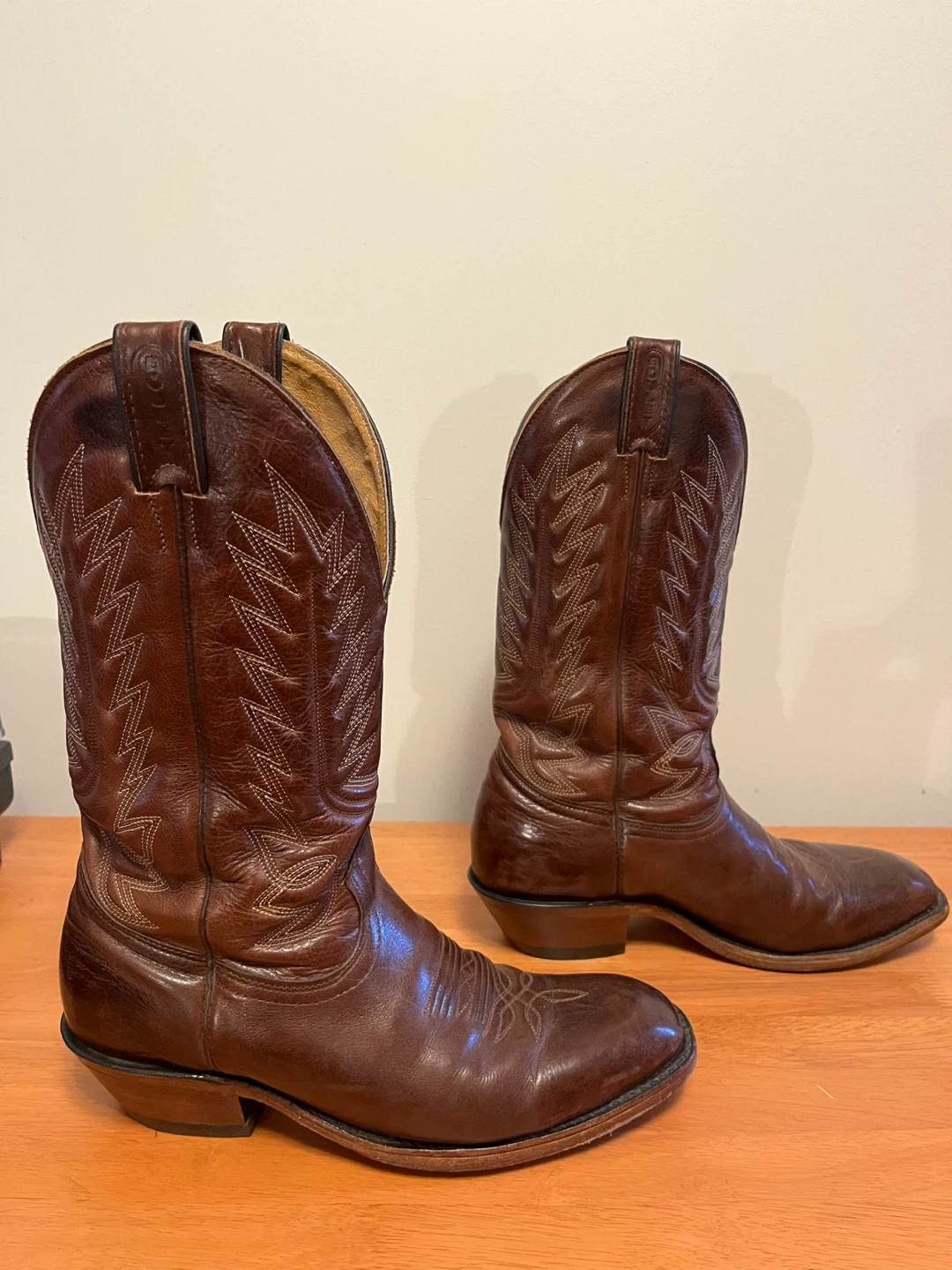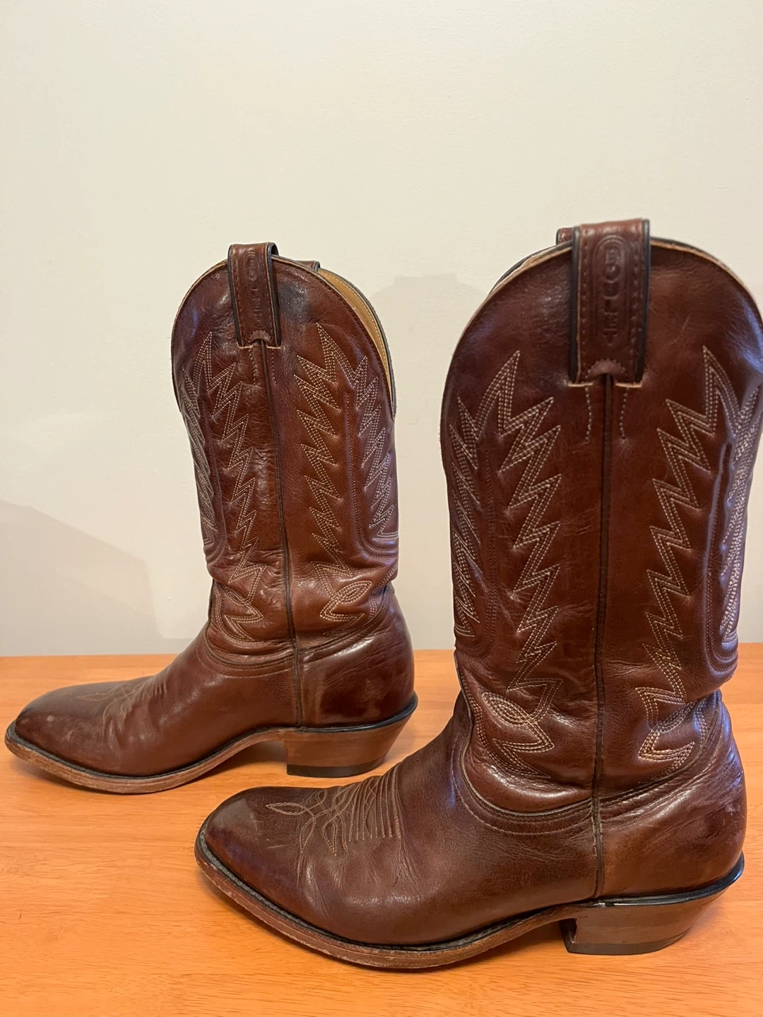 Boulet brown leather cowboy boots. Features decorative stitching on the shaft and vamp. Leather construction, full leather lining and footbed.