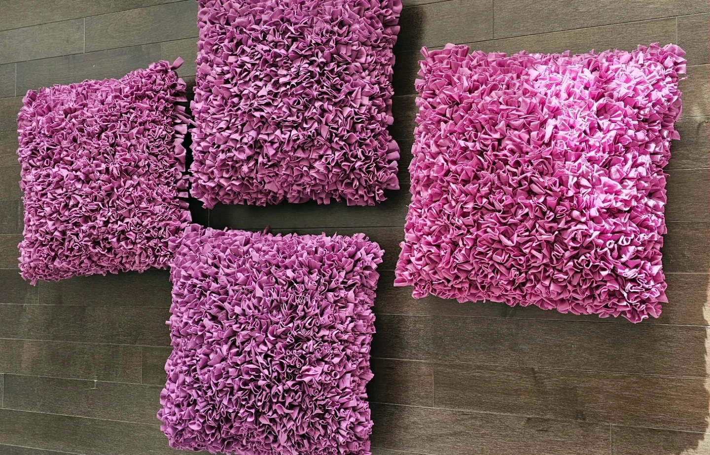 Four square throw pillows in a vibrant purple colour. They feature a textured, shaggy fabric design. Great for adding a pop of colour to any room!