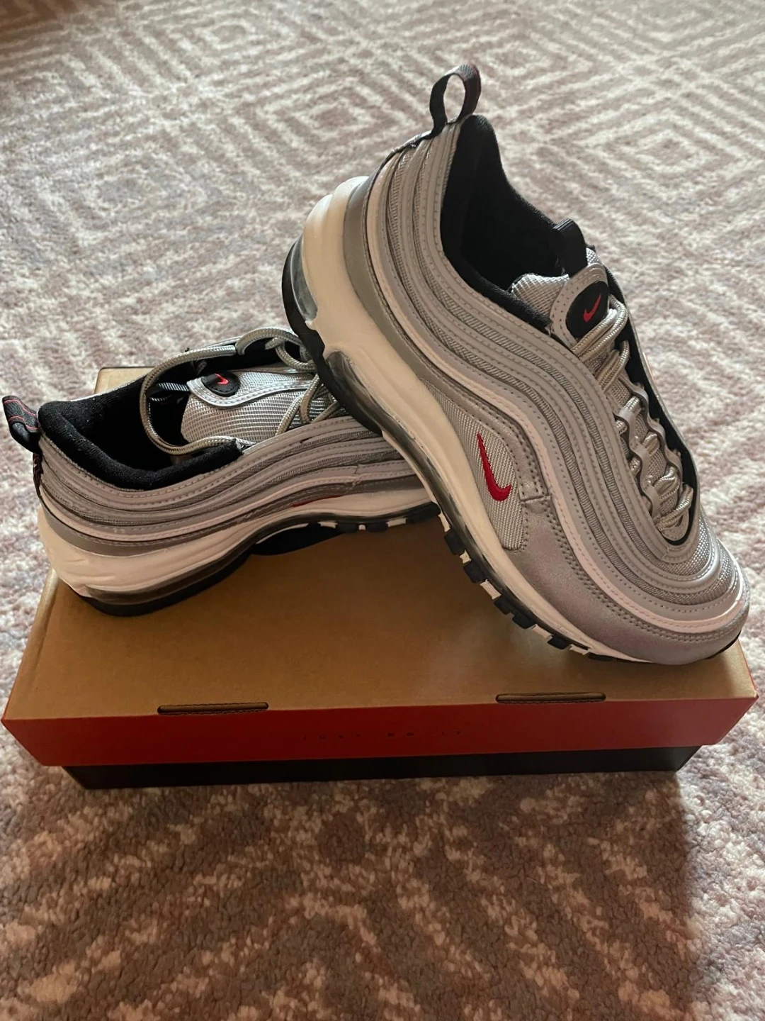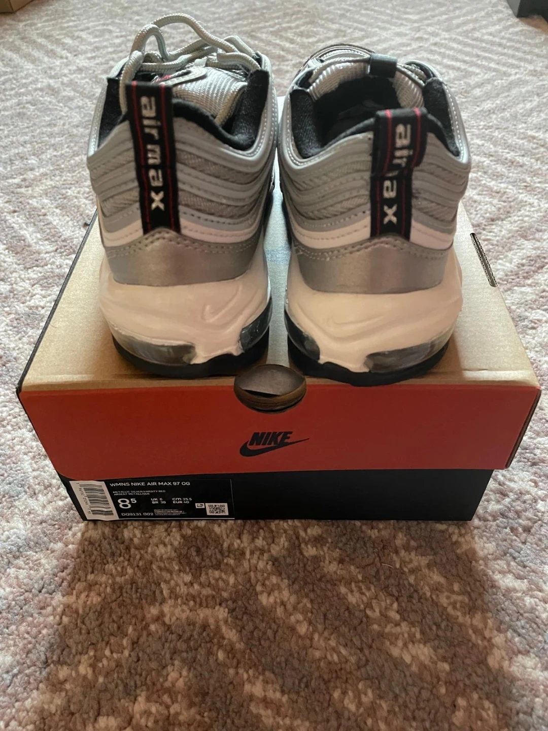 Nike Air Max 97 Silver Bullet sneakers in a women's size 8.5. They're a sleek silver colour with red accents. The original box is included with the shoes.
