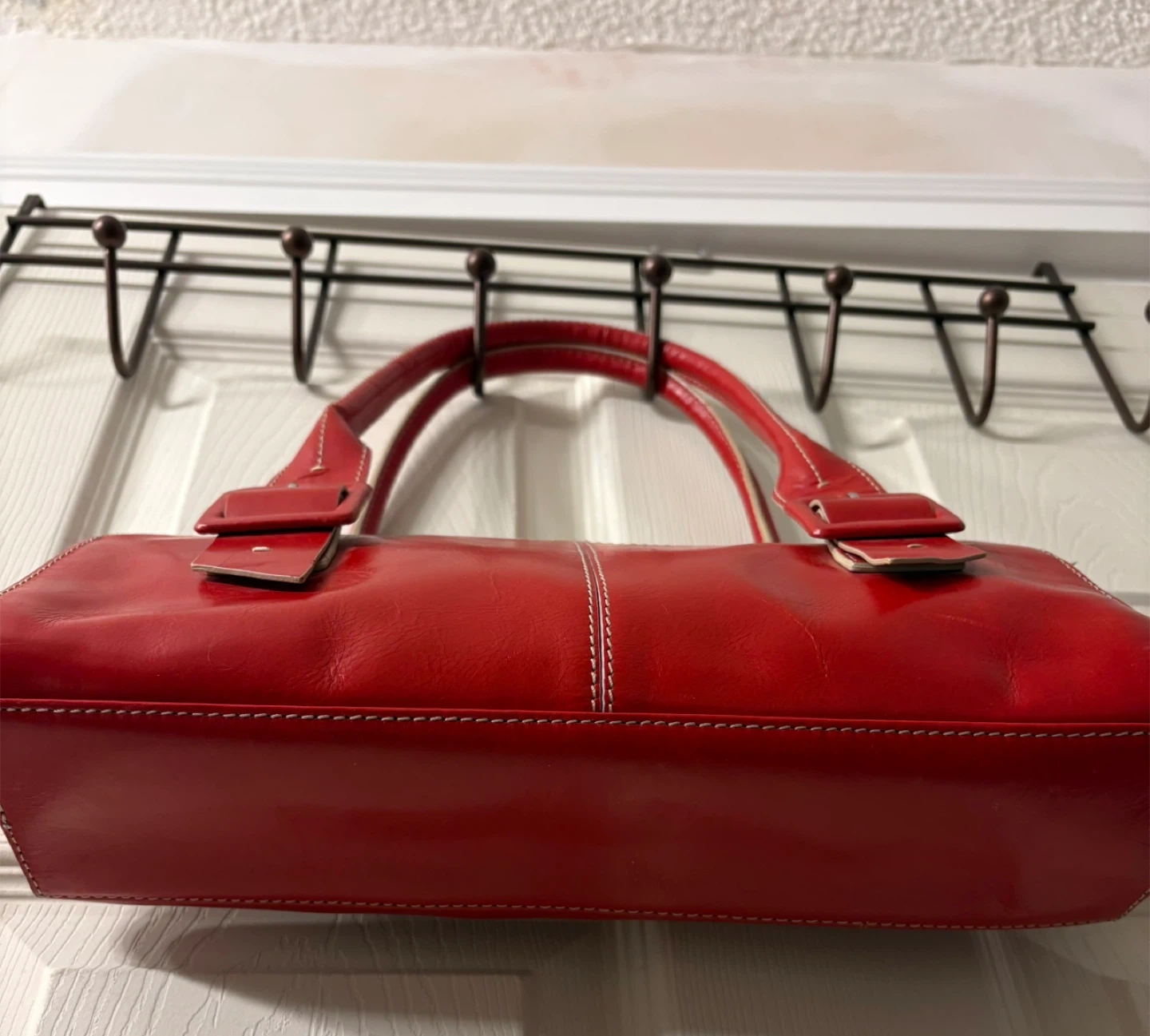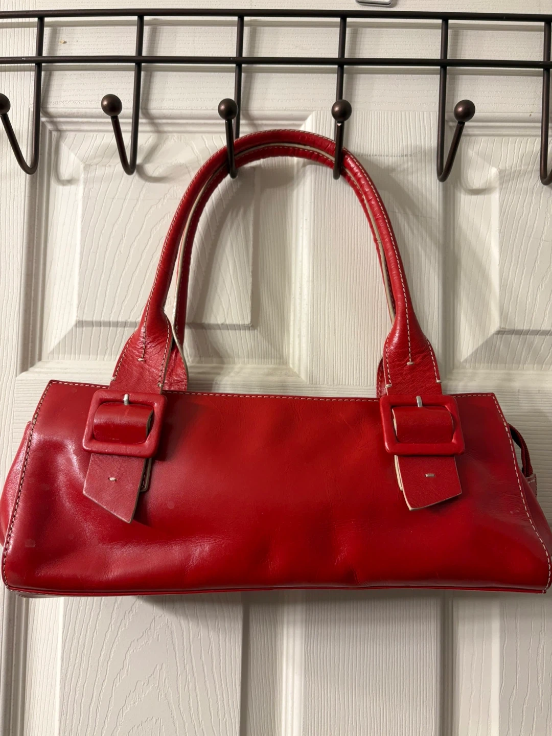 This chic red satchel bag features a glossy leather exterior with white contrast stitching. It's got two buckle details on the front and a zip closure for security. A great everyday bag! Perfect condition, really beautiful piece! Pick up in Chestermere.
