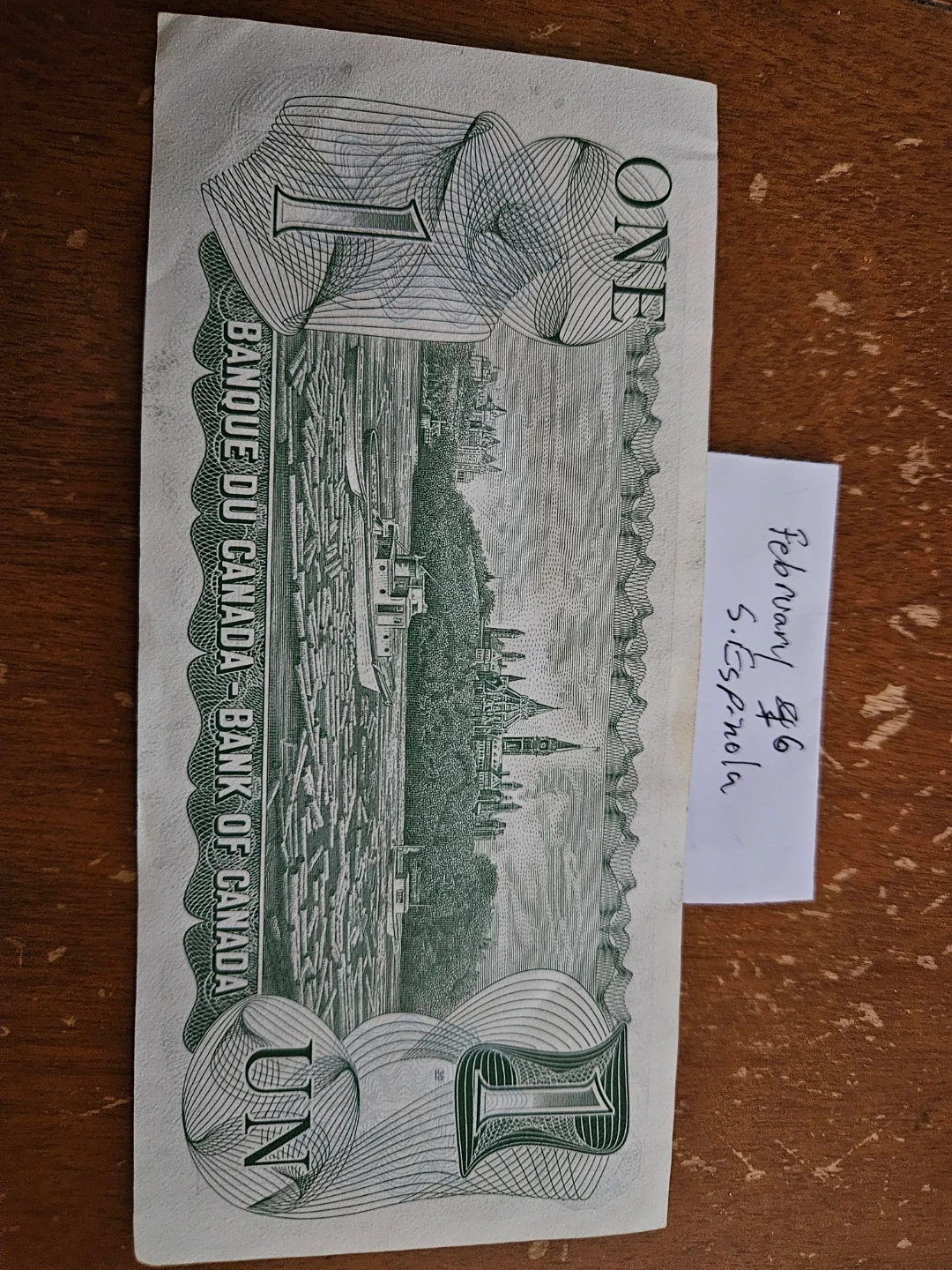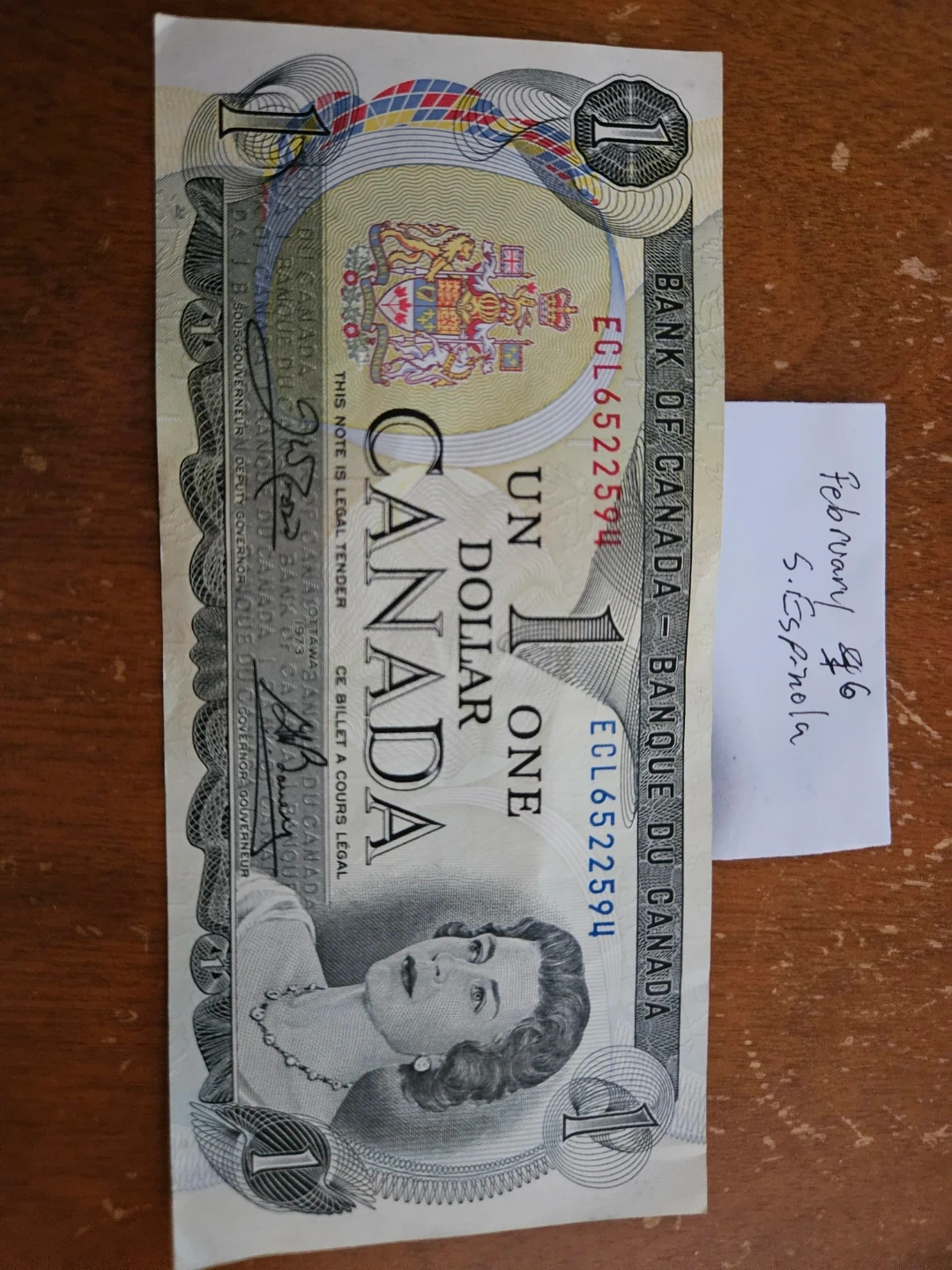 BEST OFFER. This is a 1973 Bank of Canada one dollar bill. It features Queen Elizabeth II on the front and a scene of logging on the river on the back. The serial number is EGL6522594. This bill is a great collector's item for anyone interested in Canadian currency.