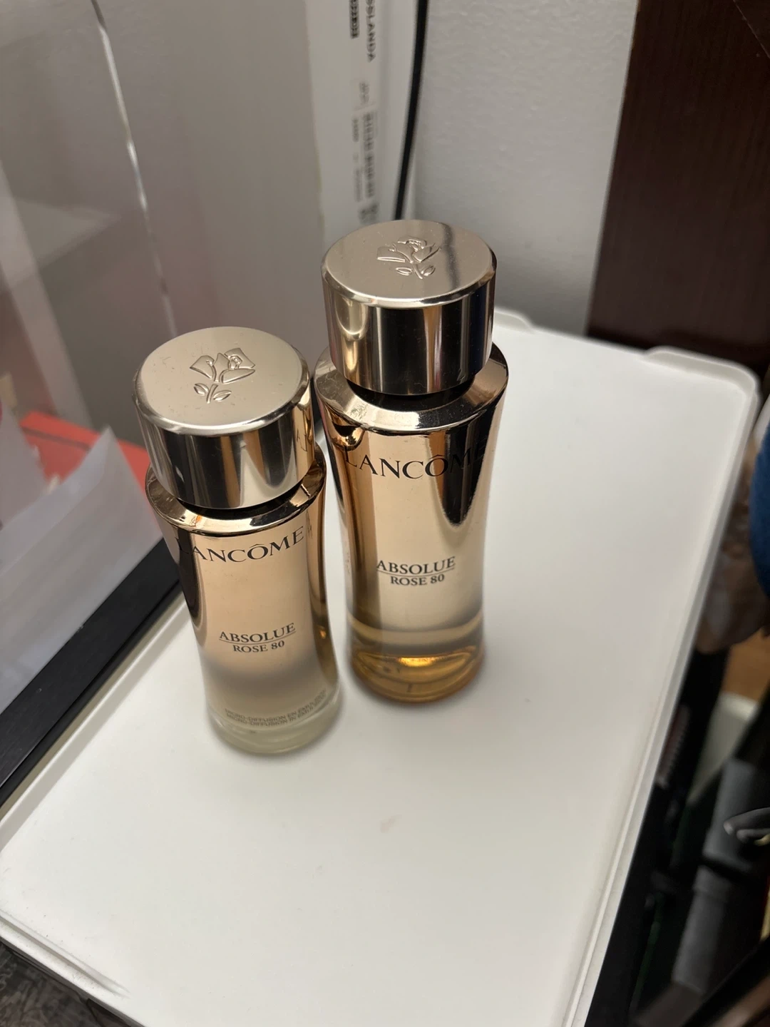Set of two Lancome Absolue Rose 80 skincare bottles. Includes one Essence-in-Lotion and one Micro-Diffusion En.Essence. Both bottles have rose gold caps and rose gold accents on the bottles.