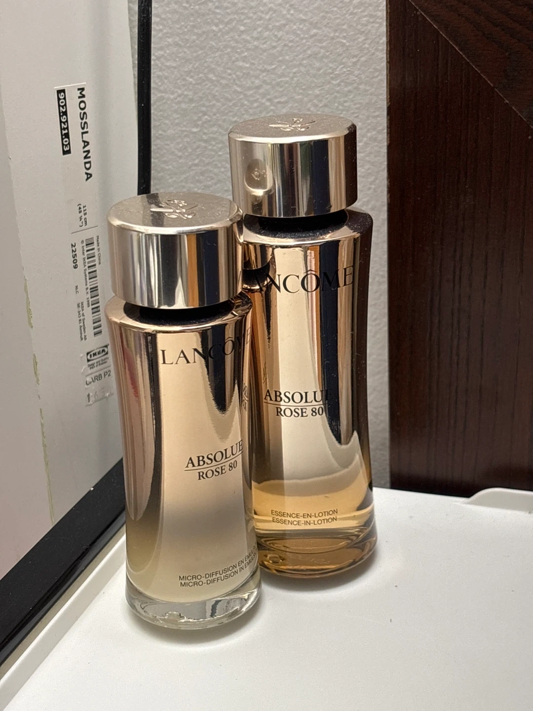 Set of two Lancome Absolue Rose 80 skincare bottles. Includes one Essence-in-Lotion and one Micro-Diffusion En.Essence. Both bottles have rose gold caps and rose gold accents on the bottles.
