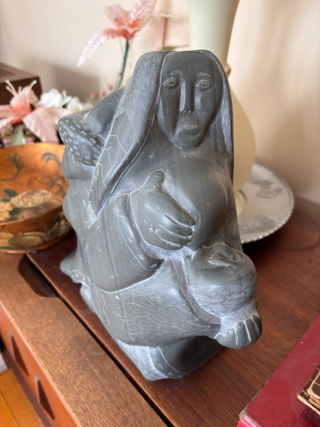 This is a hand-carved stone sculpture depicting a mother and child. The piece is made from grey soapstone and shows intricate detailing. It's a substantial piece, perfect for display.