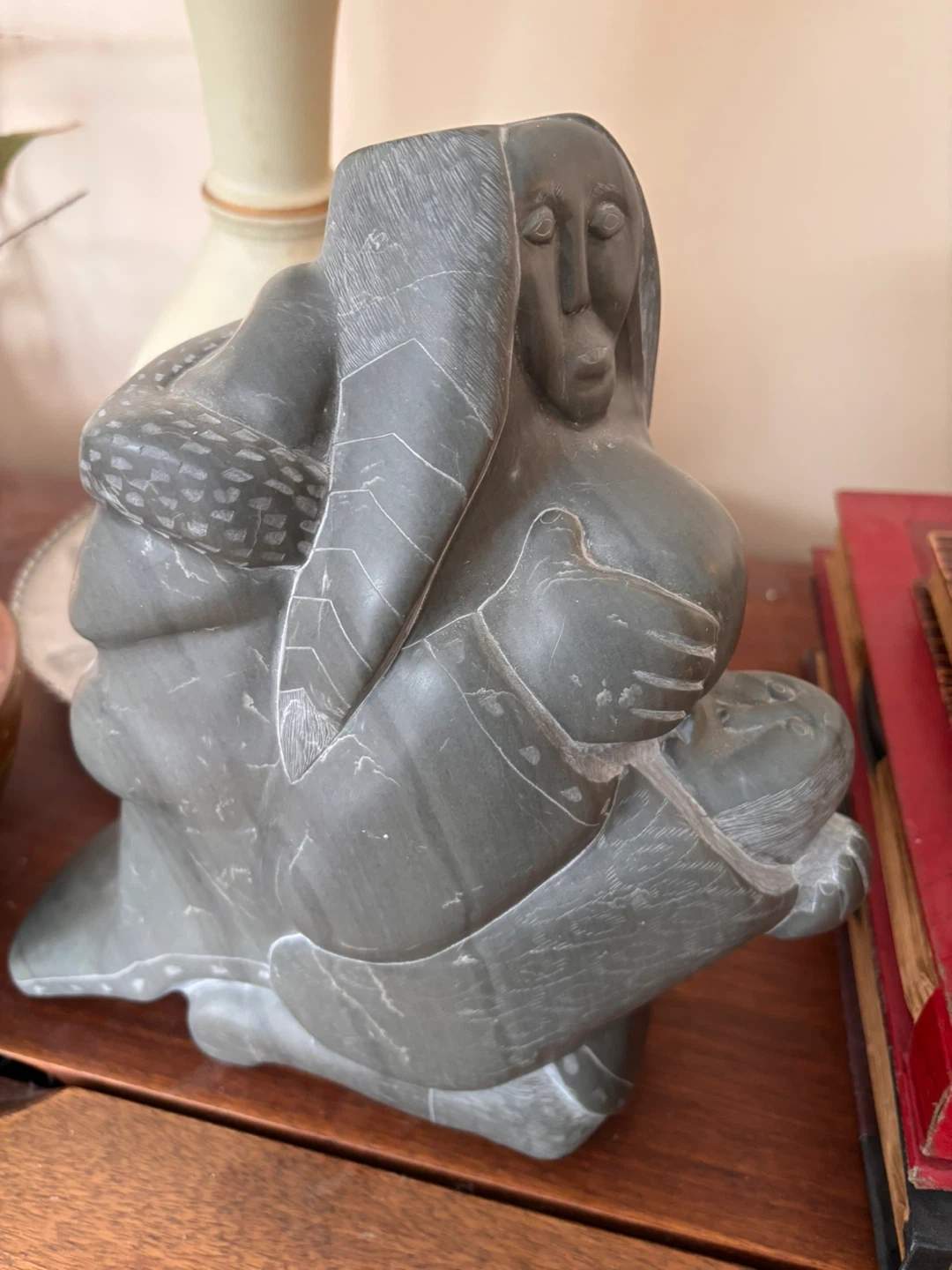 This is a hand-carved stone sculpture depicting a mother and child. The piece is made from grey soapstone and shows intricate detailing. It's a substantial piece, perfect for display.
