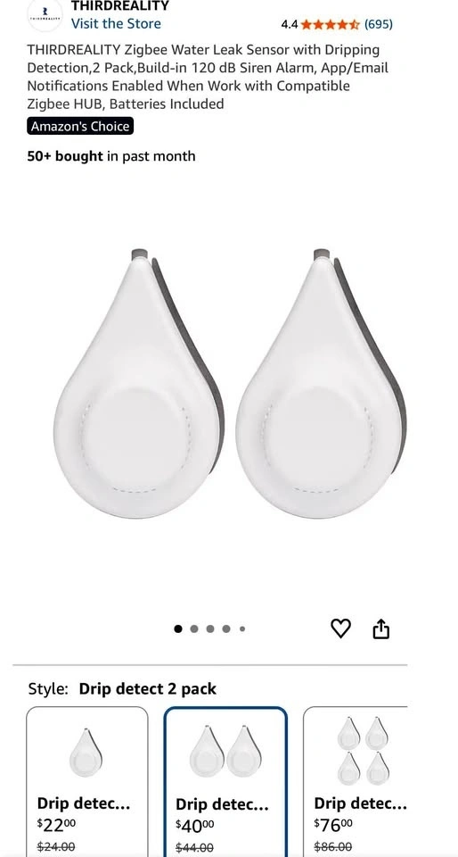 New THIRDREALITY Zigbee Water Leak Sensor with Dripping Detection, 2 Pack, Build-in 120 dB Siren Alarm, App/Email Notifications Enabled When Work with Compatible Zigbee HUB, Batteries Included