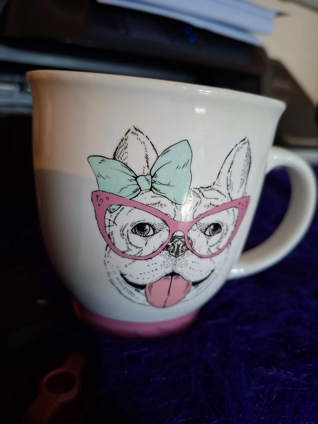 This cute white mug features a graphic of a French bulldog wearing glasses and a bow. It's microwave and dishwasher safe for easy use and care. This mug is perfect for enjoying your morning coffee or tea!