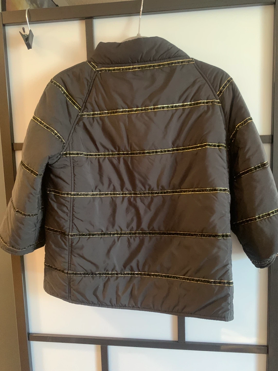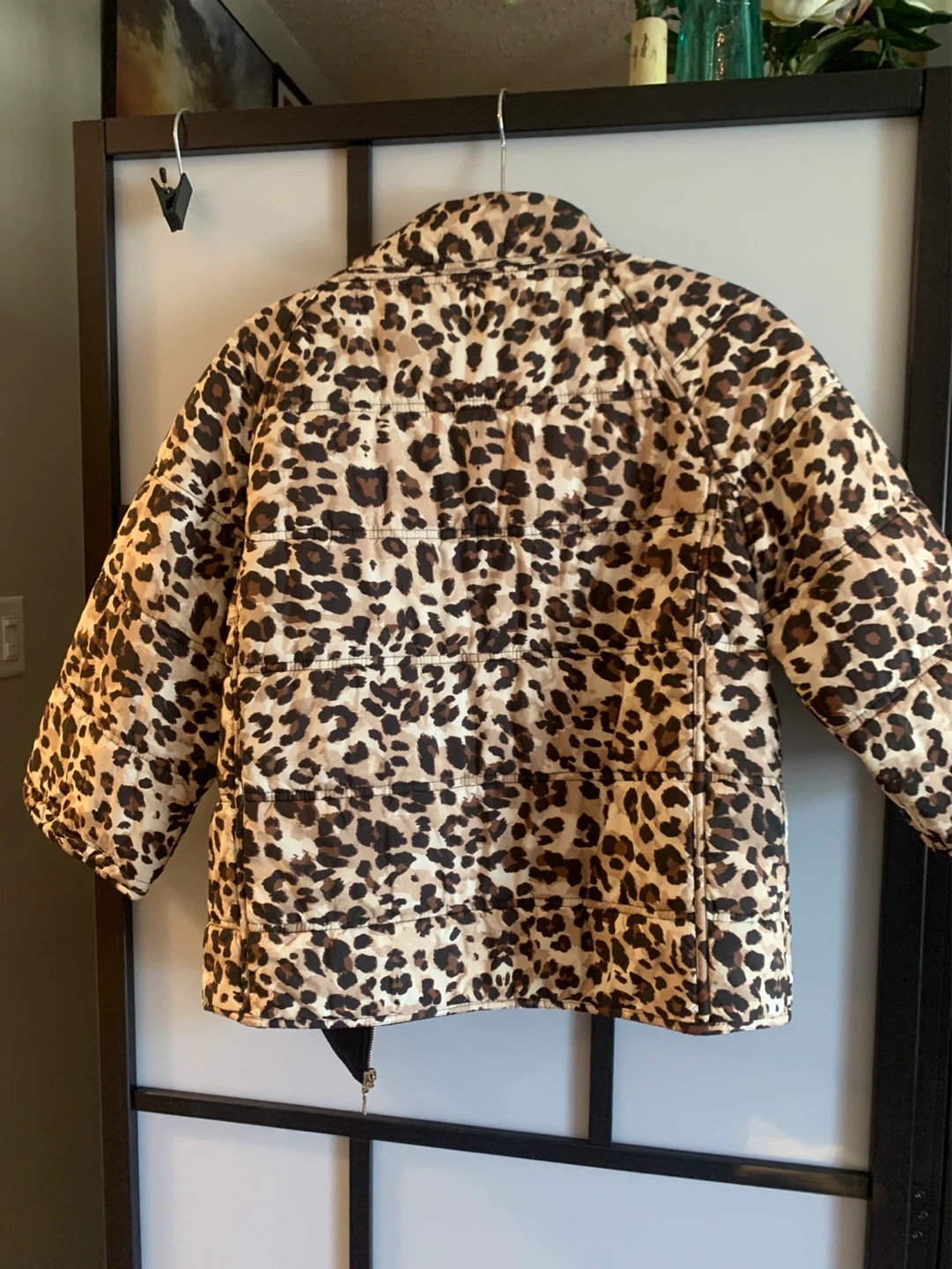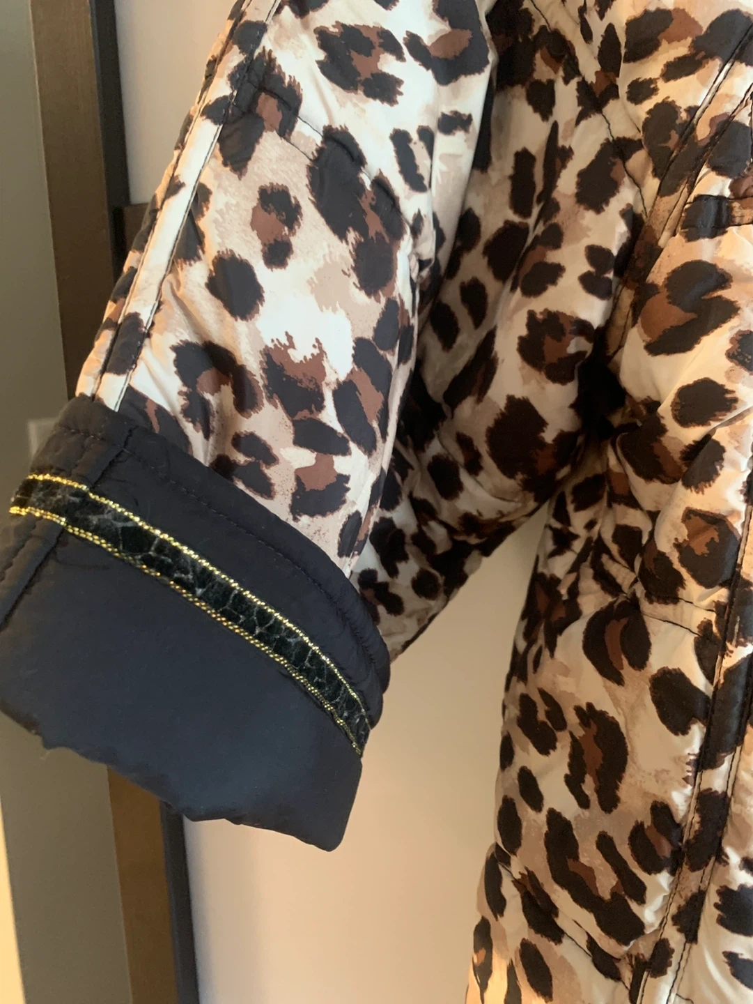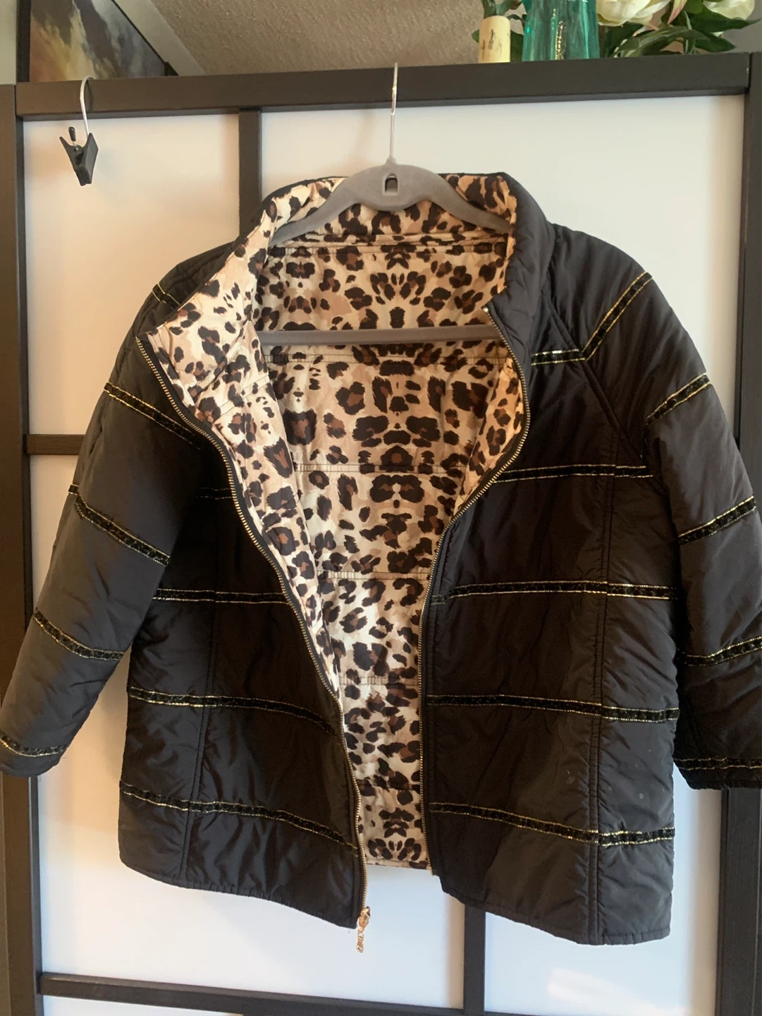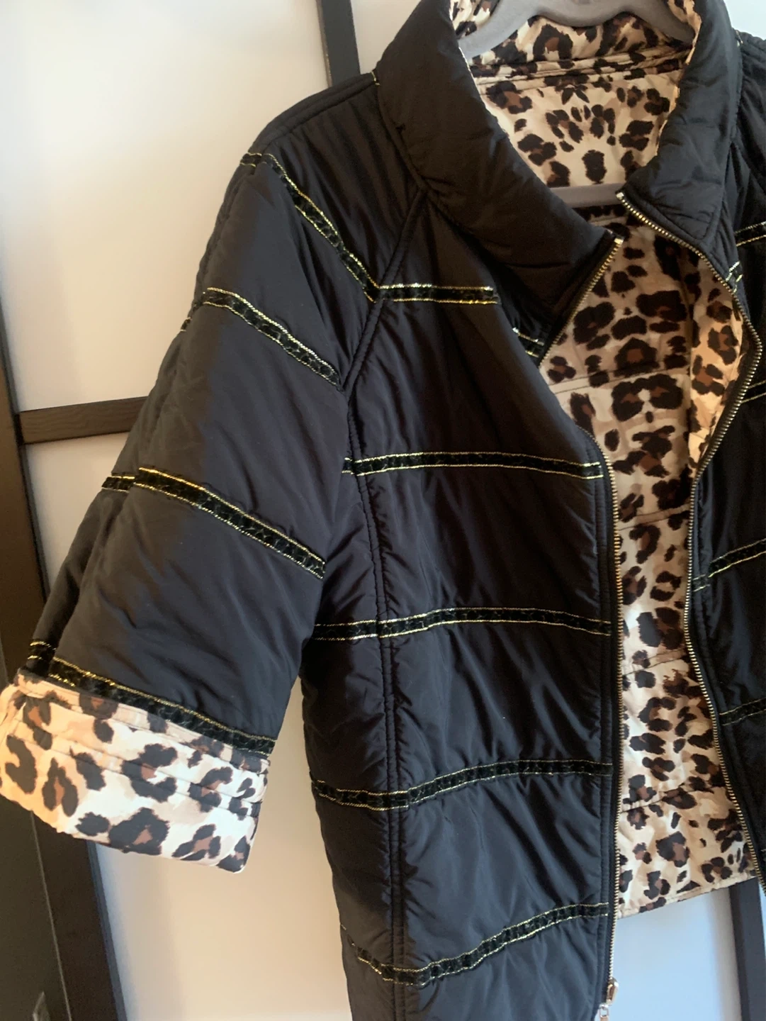 Reversible puffer jacket featuring a fun leopard print on one side and a black design with gold stripe accents on the other. It's a stylish outerwear option !