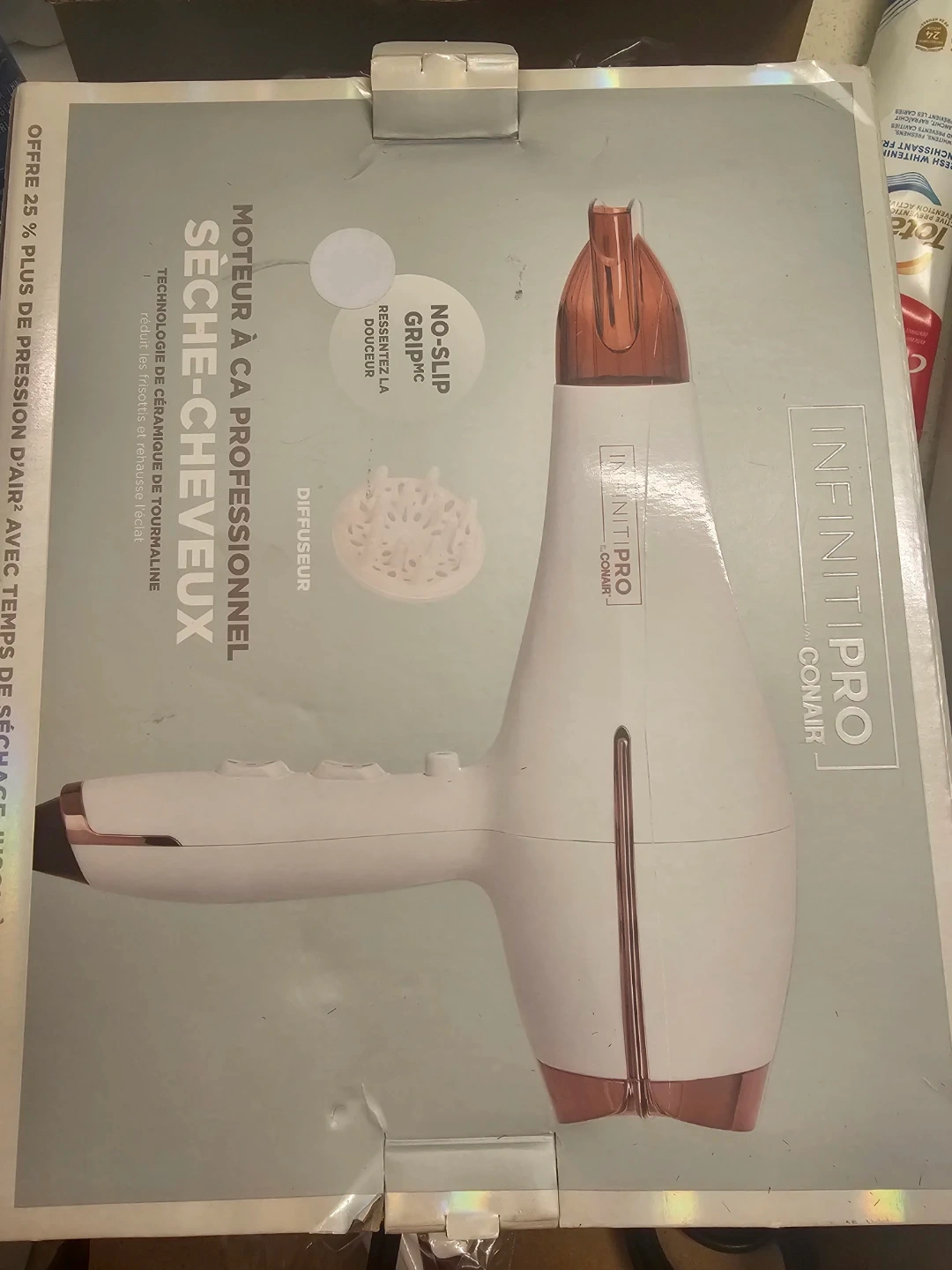 This InfinitiPro hair dryer by Conair comes with a diffuser attachment. It features ceramic tourmaline technology for reduced frizz. The professional motor ensures powerful drying.