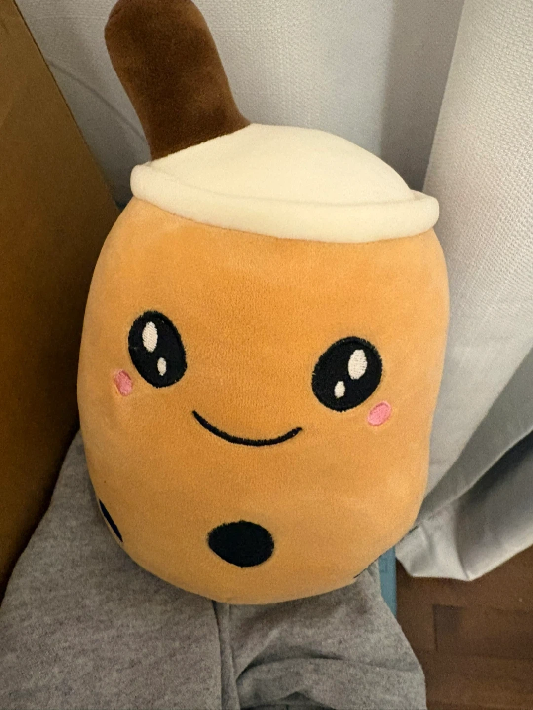 This is a super soft and huggable plush toy shaped like a bubble tea drink. It's orange with a brown straw and white foam topping. It has a happy, smiling face with cute black eyes and rosy cheeks. Great for fans of boba tea!