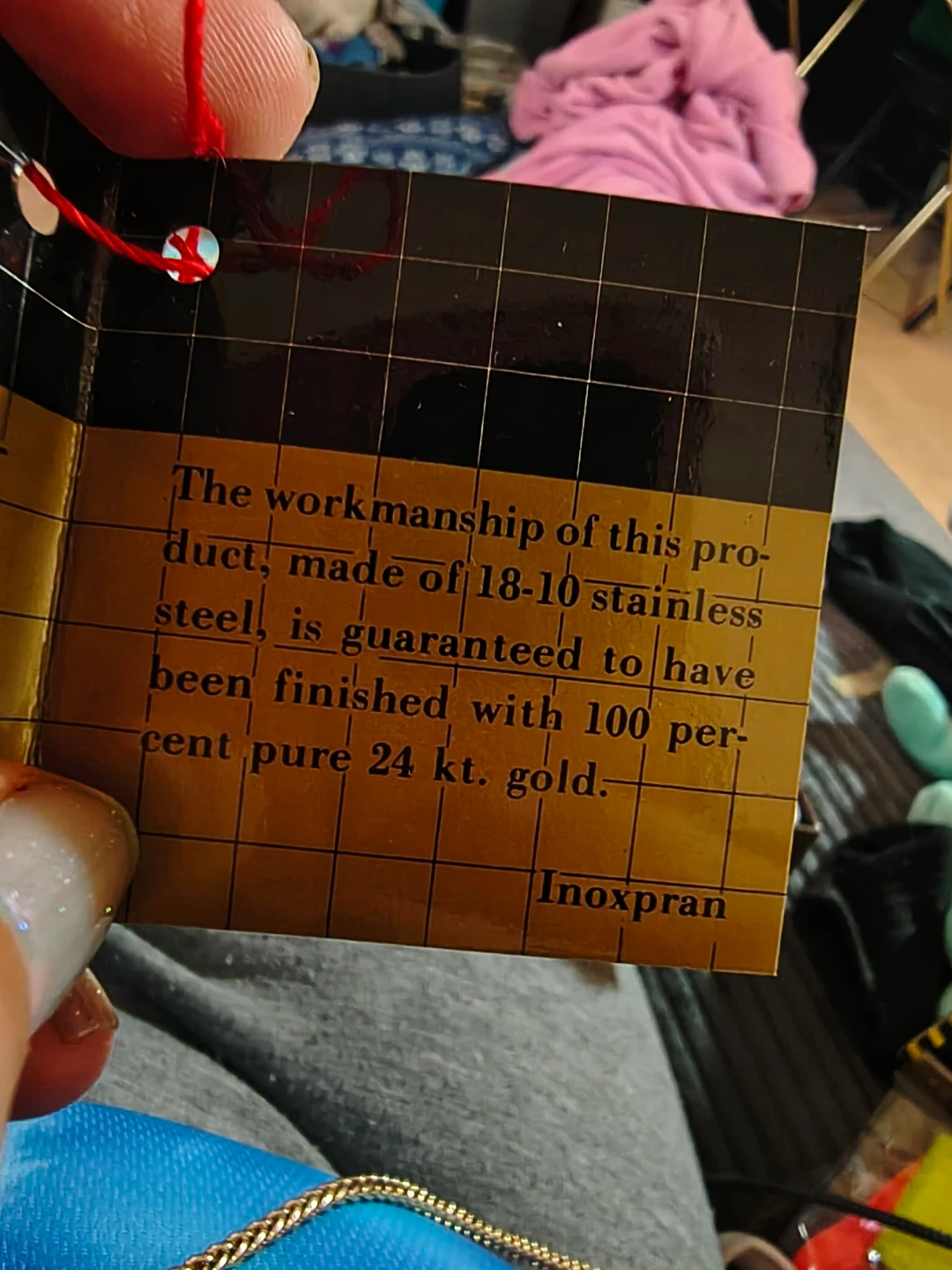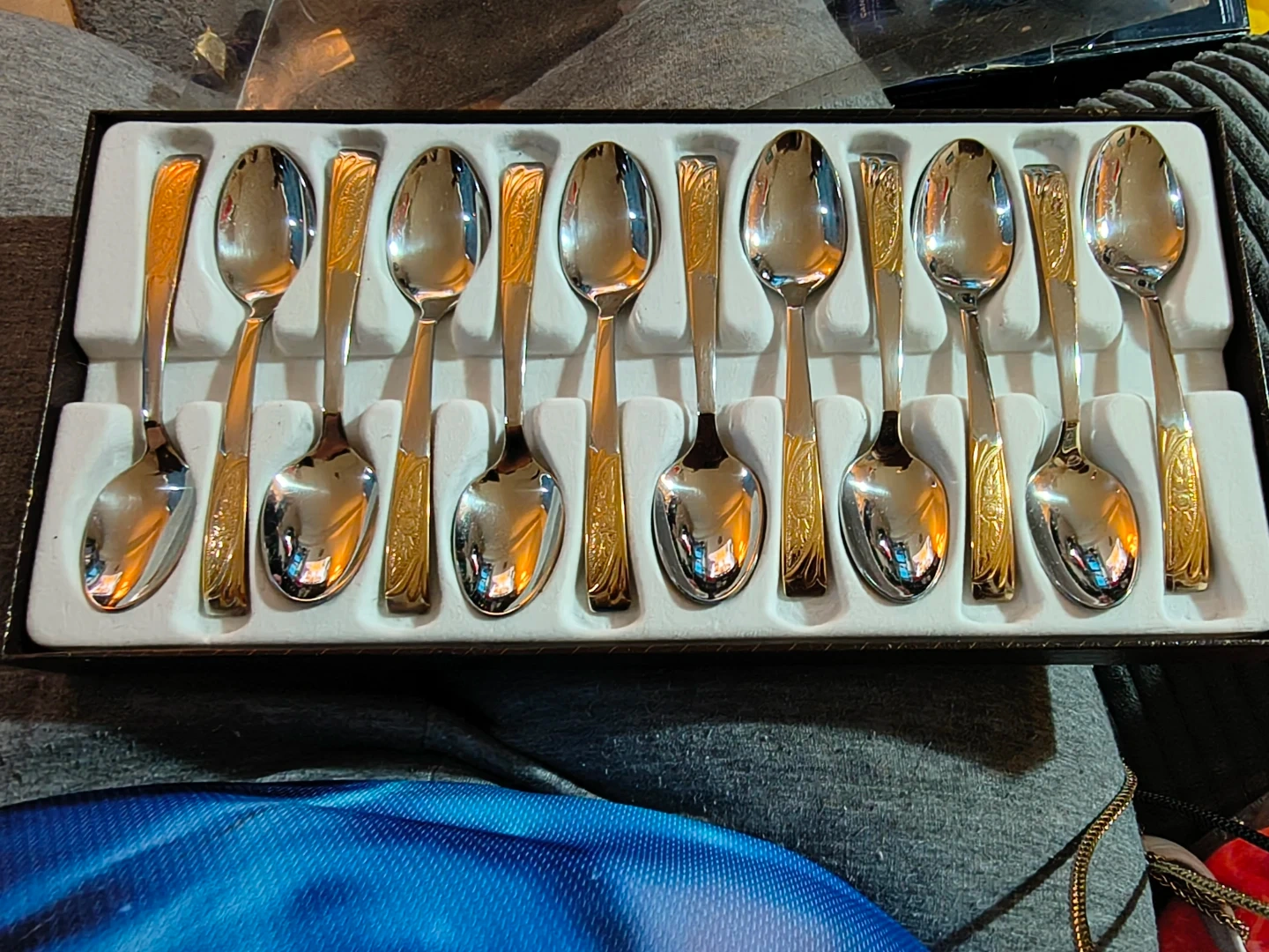 This is a set of 12 Inoxpran Linea Gold spoons. Each spoon has a polished silver finish with gold-coloured decorative handles. These spoons are made of stainless steel. Finished in 24k gold. Comes with a certificate of authenticity.