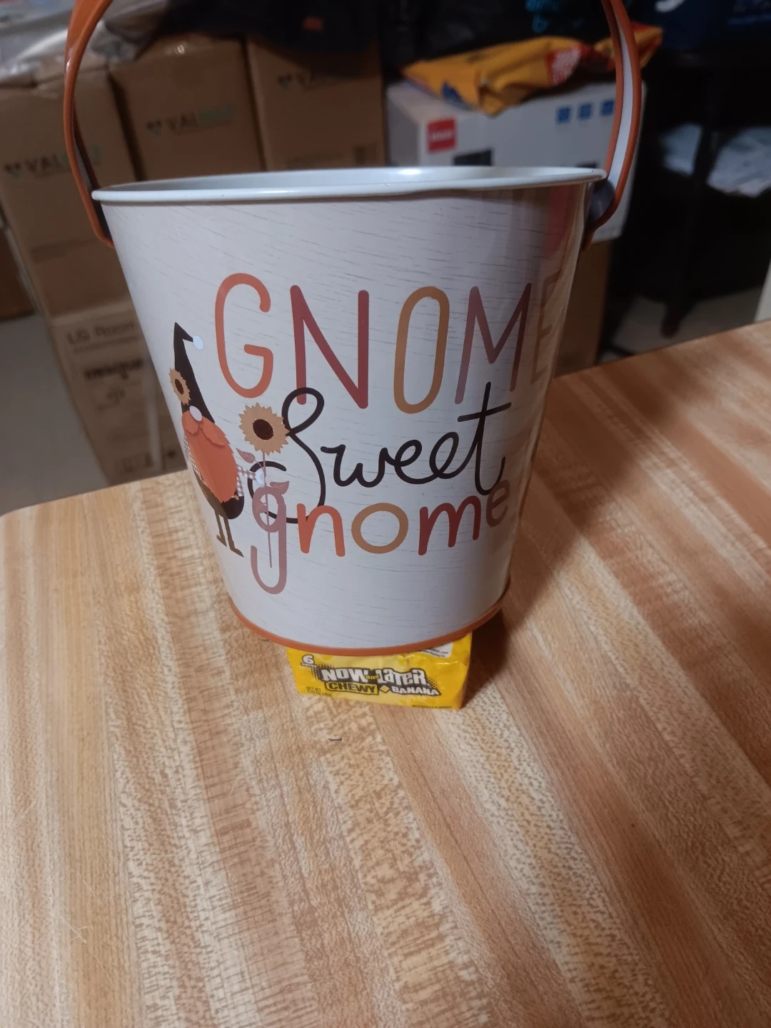 Cute tin bucket with a gnome "Gnome Sweet Gnome" design. It has a handle for carrying. Perfect for small decorations or storage!