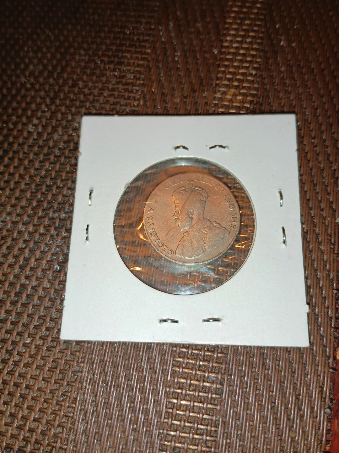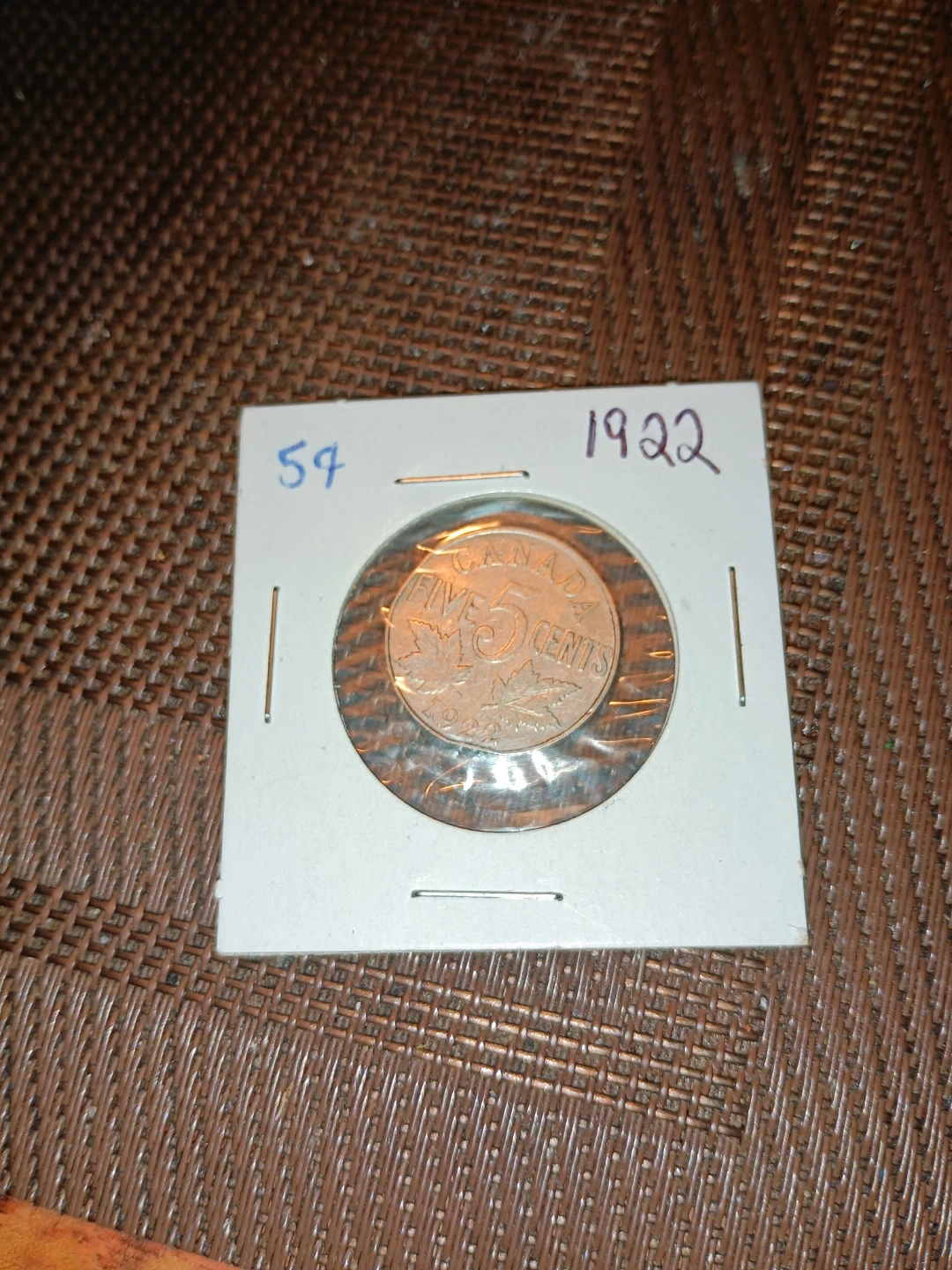 A 1922 Canadian five cents coin is shown, dated on the packaging. The coin features King George V on one side and a maple leaf on the other. This coin is housed in a protective sleeve.
