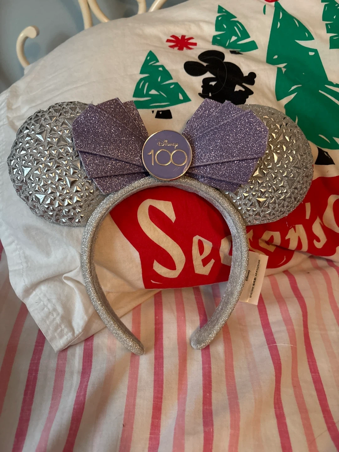 Celebrate a century of magic with these sparkly Disney 100th anniversary Minnie Mouse ears. Features silver textured ears and a glittery purple bow with a Disney 100 medallion. Headband is silver glittered.