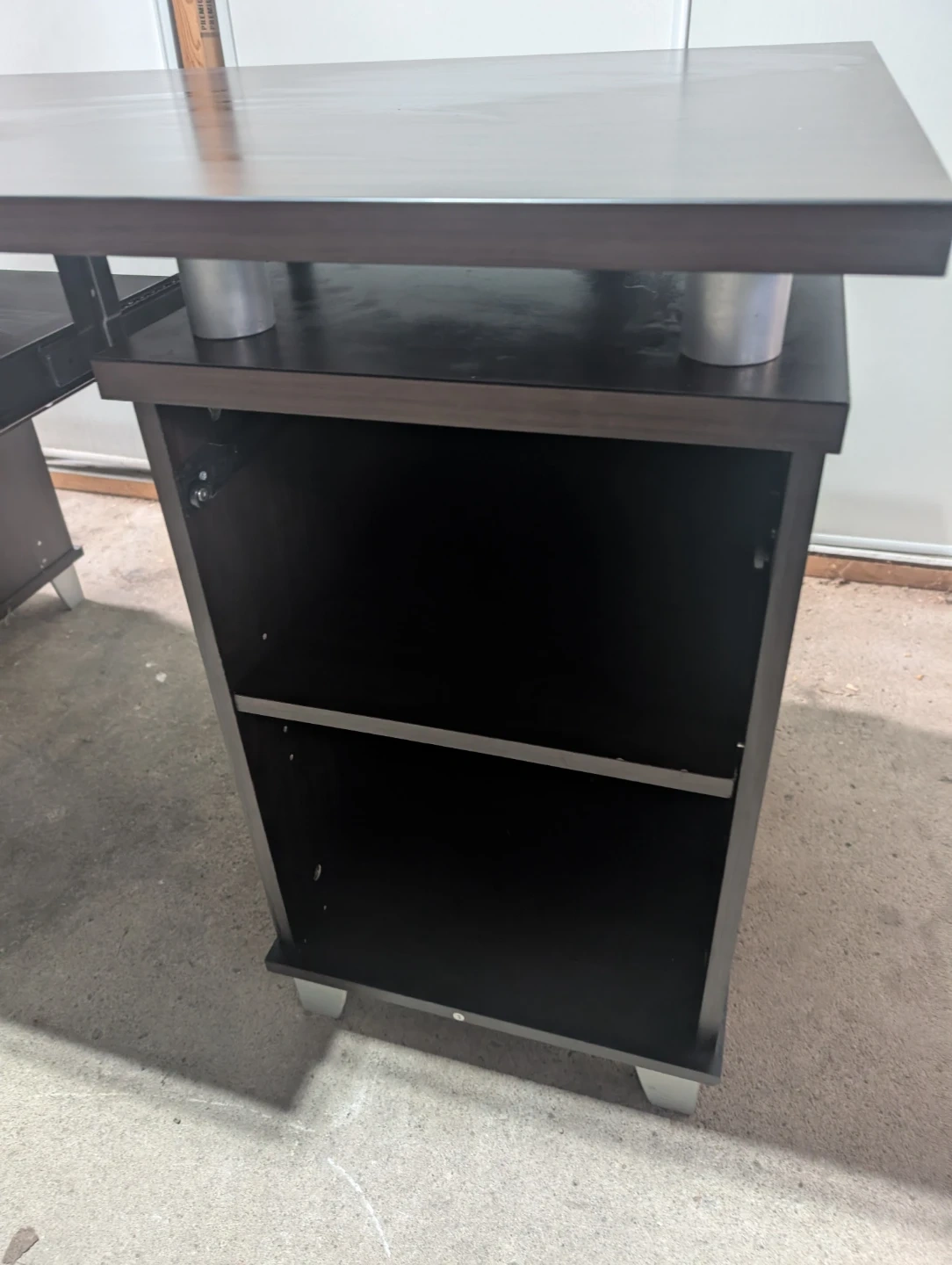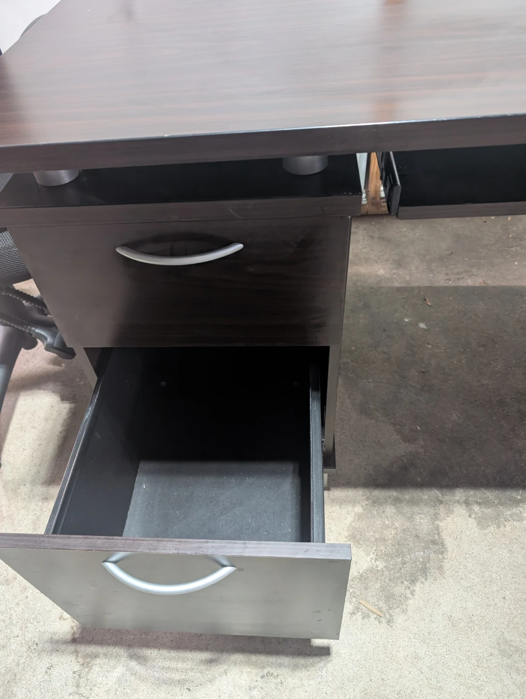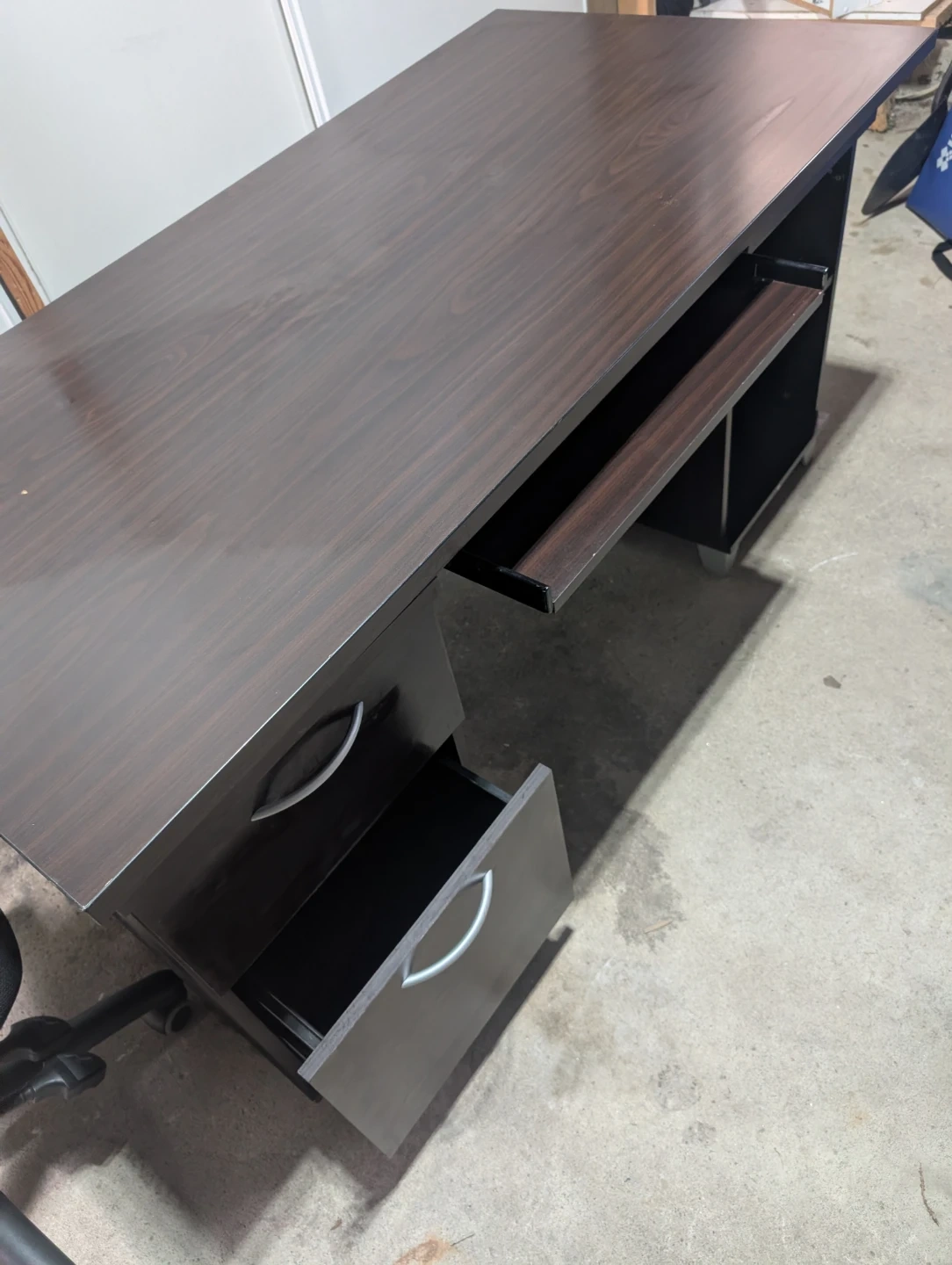 This is a dark brown desk with two drawers and a pull-out keyboard tray. It also has an open shelving unit on the side. Has a little chip on the top. The top small drawer on the right is missing but it's barely noticeable. It's a heavy solid piece of furniture. 150x75x75cm