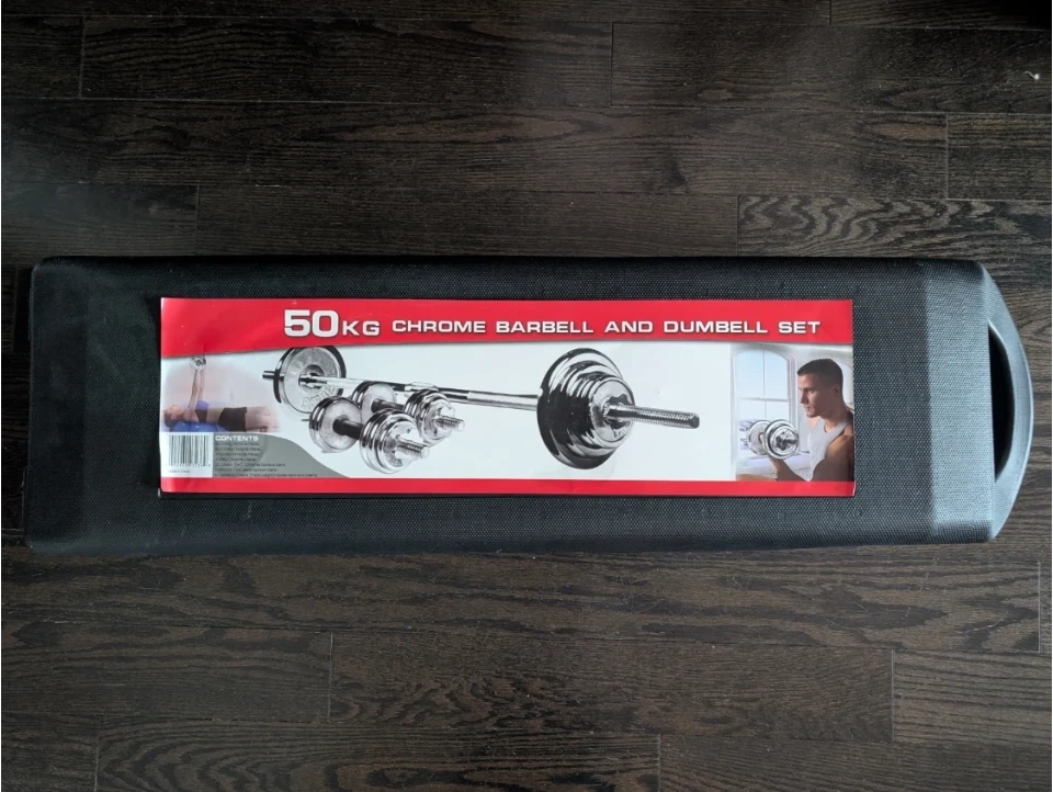 This 50kg chrome barbell and dumbbell set comes with multiple weight plates. The set includes one barbells, two dumbbells, and spin locks. All pieces store neatly in the included carrying case with wheels.