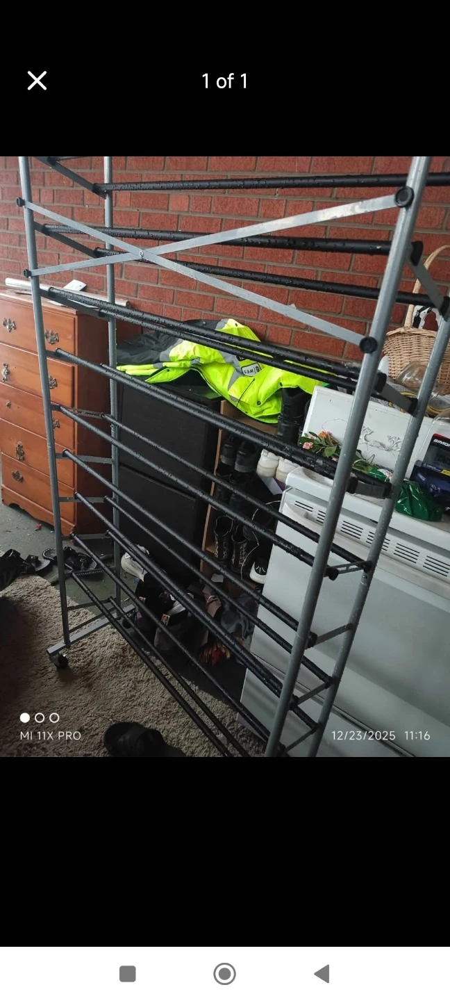 This is a multi-tier shoe rack with black metal bars and a grey frame. It's designed for shoe storage and has wheels for easy movement. It's a practical solution for keeping footwear organized.
