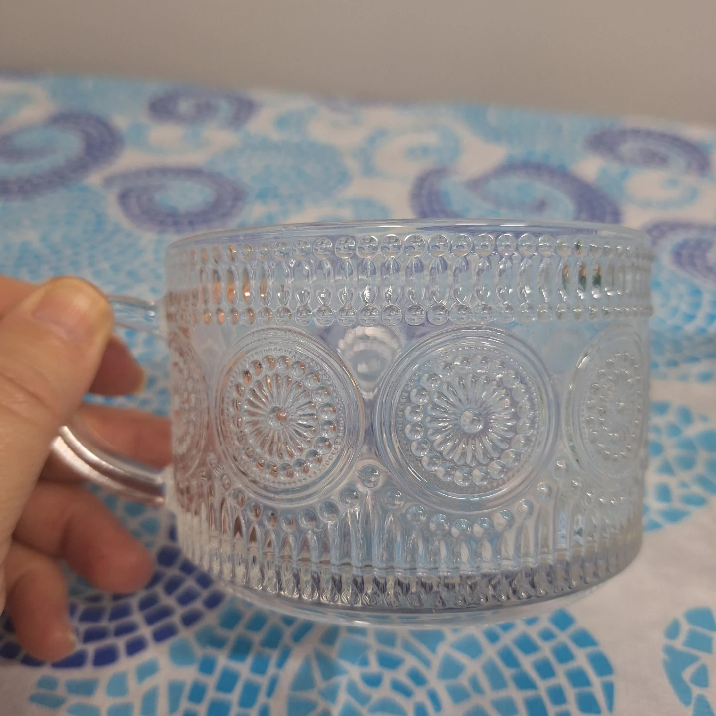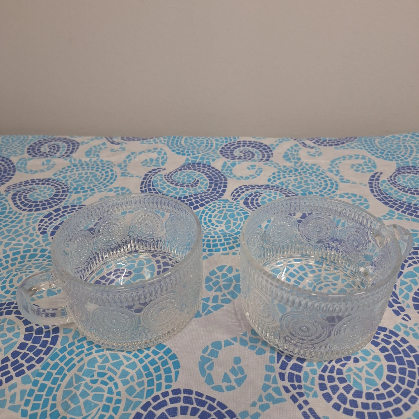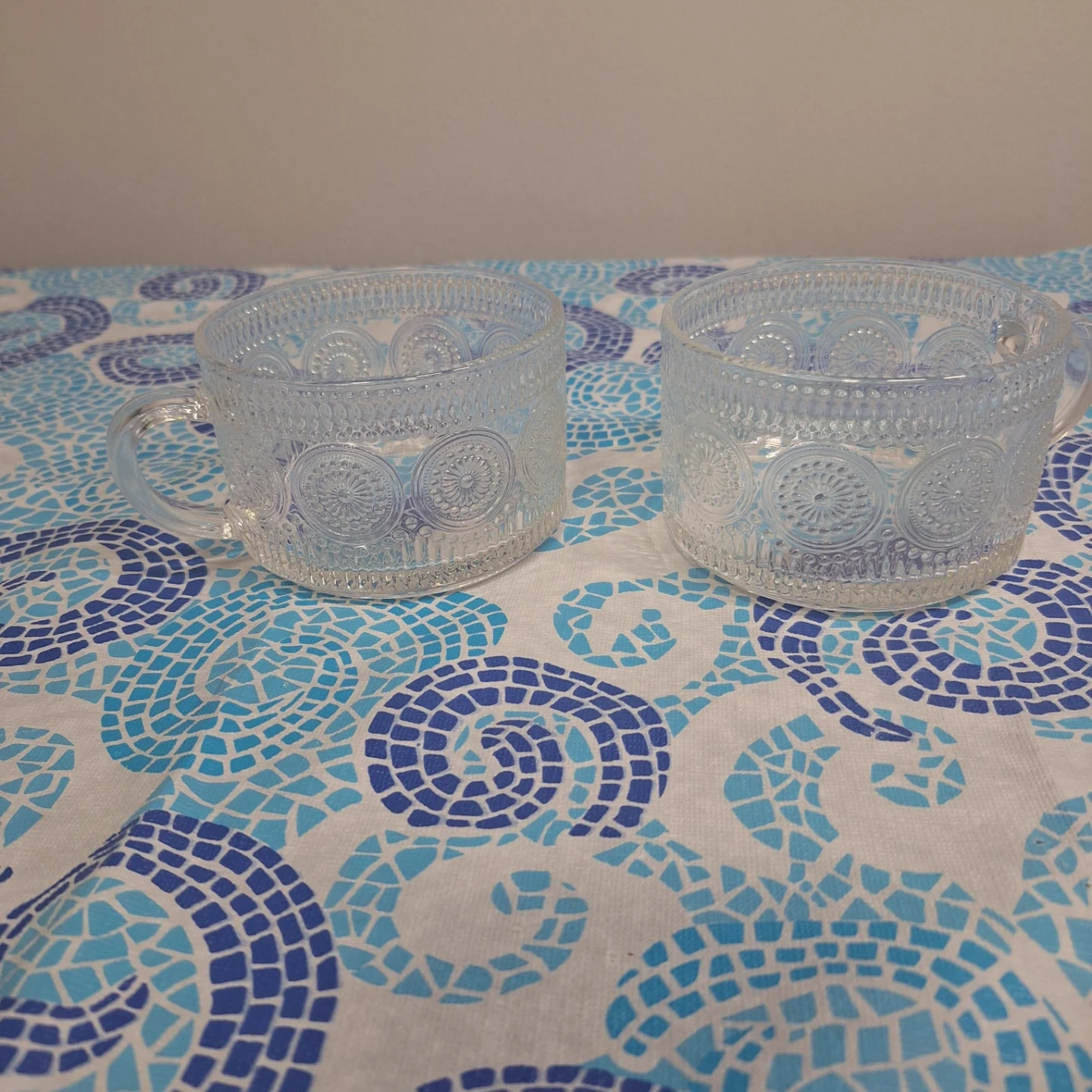 Selling a set of two vintage-style glass mugs. They feature a lovely embossed design and are in great condition. Perfect for enjoying your morning coffee or tea!