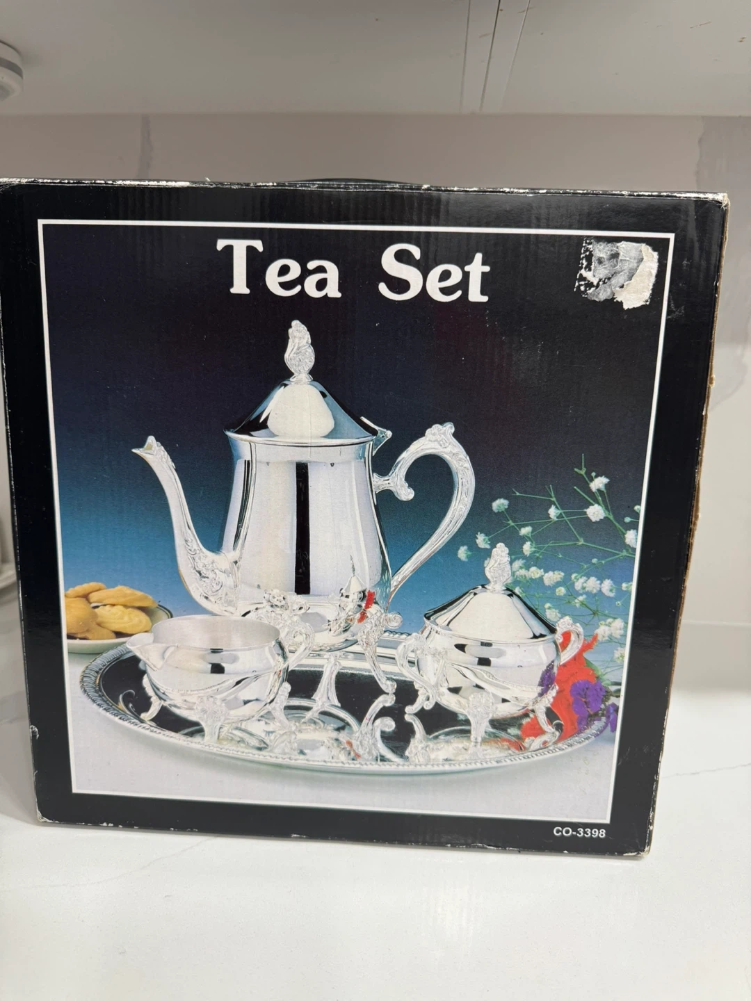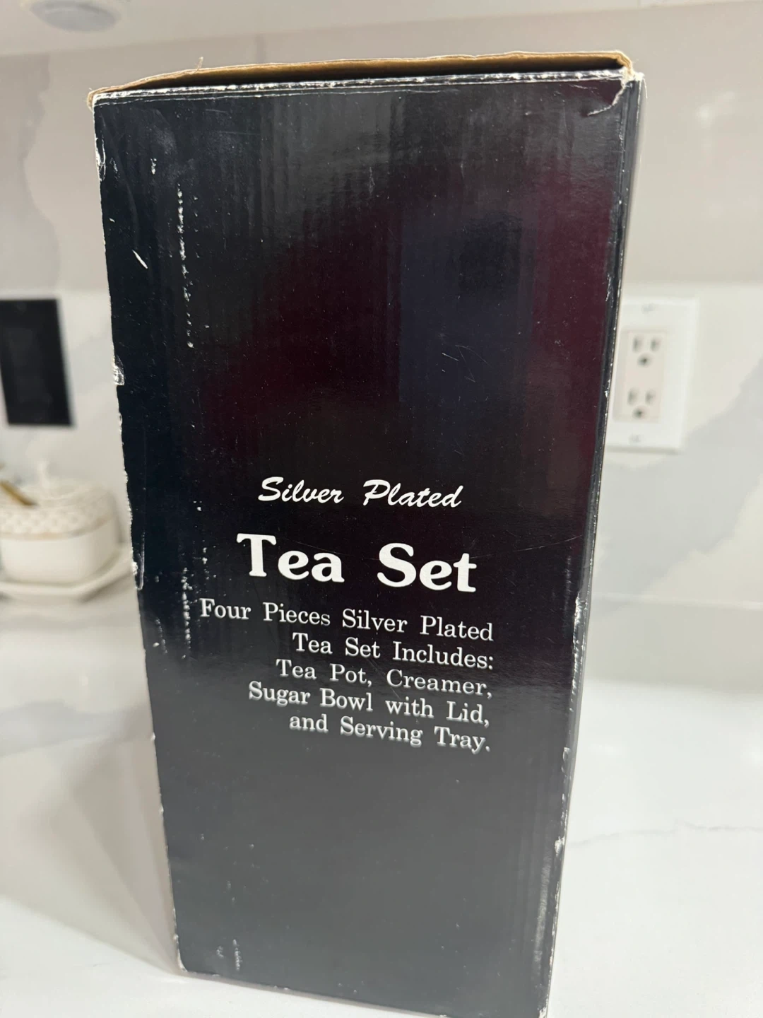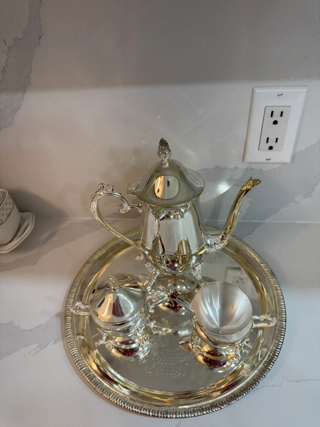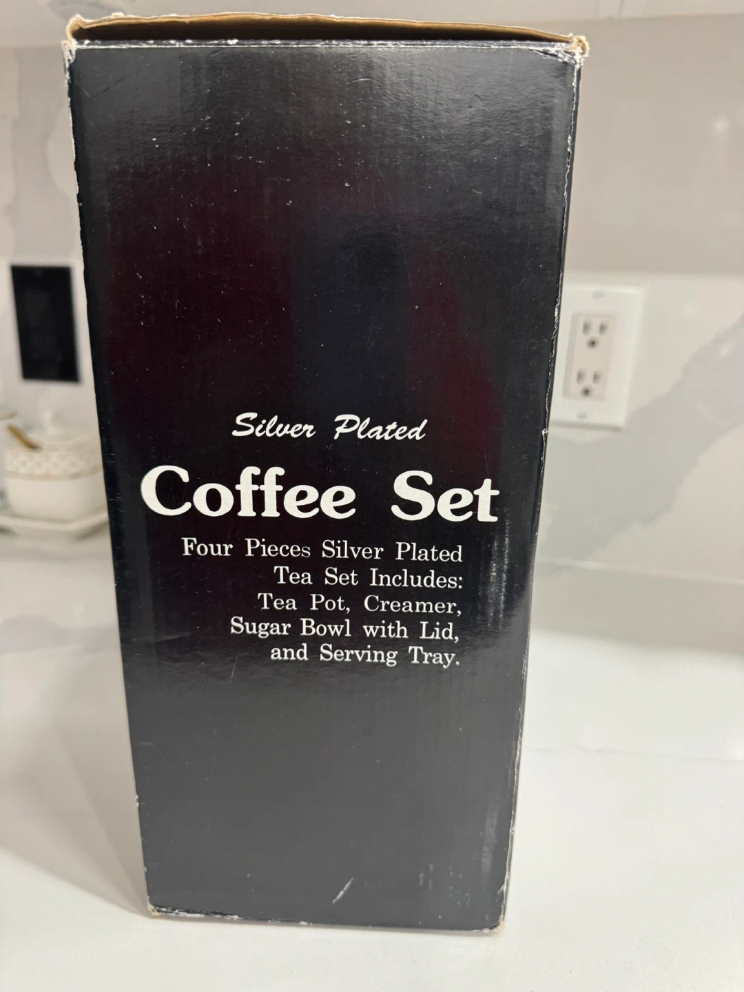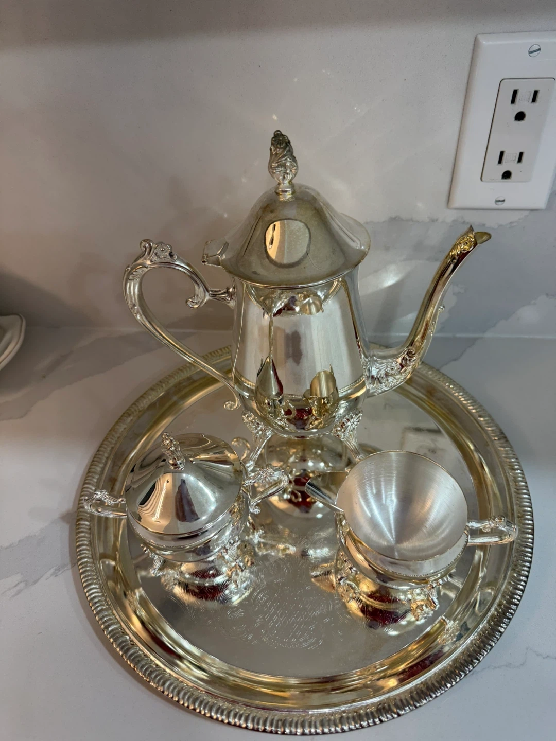 Four-piece silver-plated tea set or coffee set Includes a tea pot, creamer, sugar bowl with lid, and serving tray. Elegant design for serving beverages. It was stored in our storage room and never got the chance to be used.” Pick up at Steeles & Bathurst area.