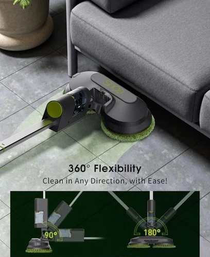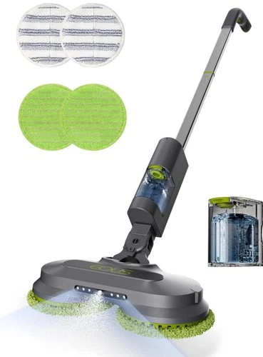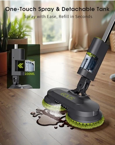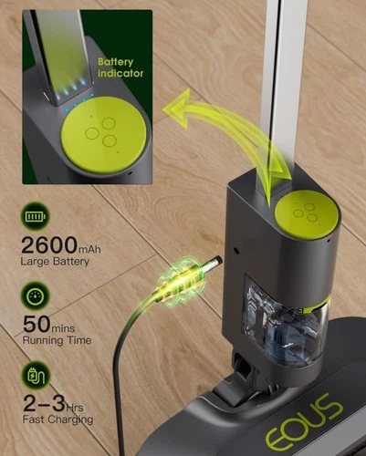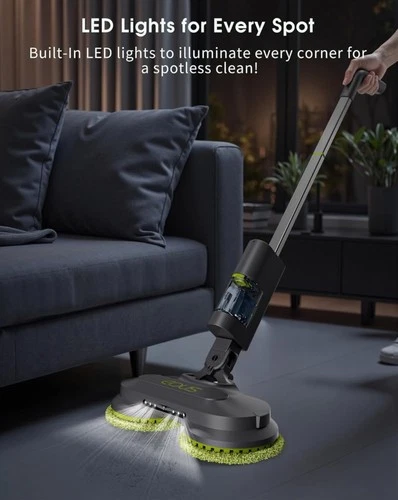 The eous Cordless Electric Mop is a green-colored cleaning tool that offers convenience and efficiency. With its detachable water tank and water sprayer, users can easily fill and refill the tank, making it easy to use for various cleaning tasks. The LED headlights on this mop provide improved visibility, ensuring a thorough and precise cleaning experience. The eous Cordless Electric Mop is a reliable and versatile choice for maintaining a spotless home.