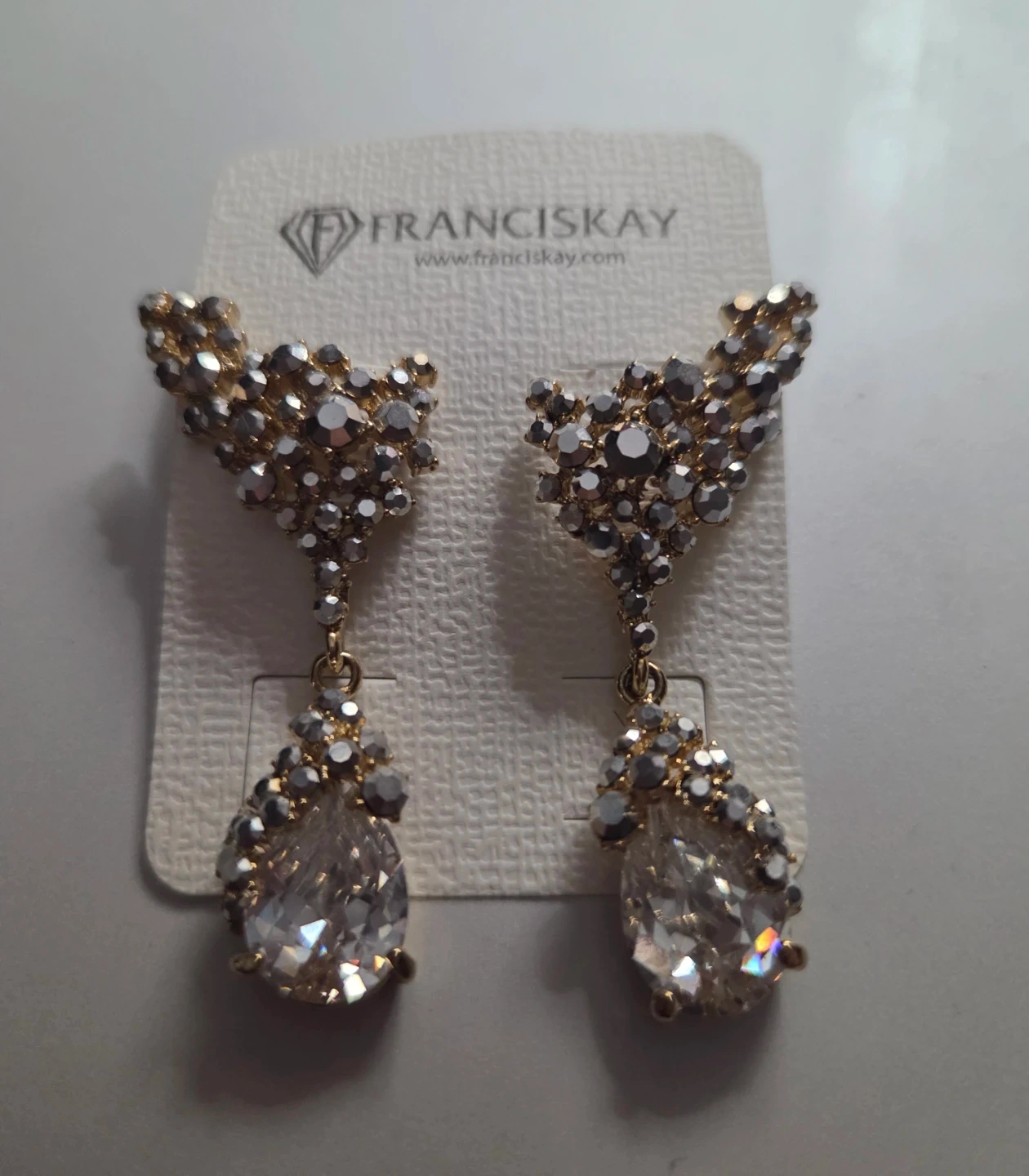 Sparkling Francis Kay earrings featuring a cluster of crystals leading to a teardrop-shaped faux diamond. Gold-tone metal with faceted clear and grey-toned stones. Perfect for adding a touch of glamour to any outfit!