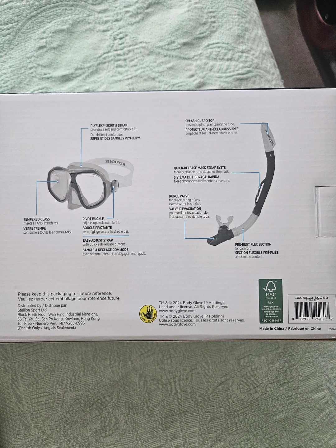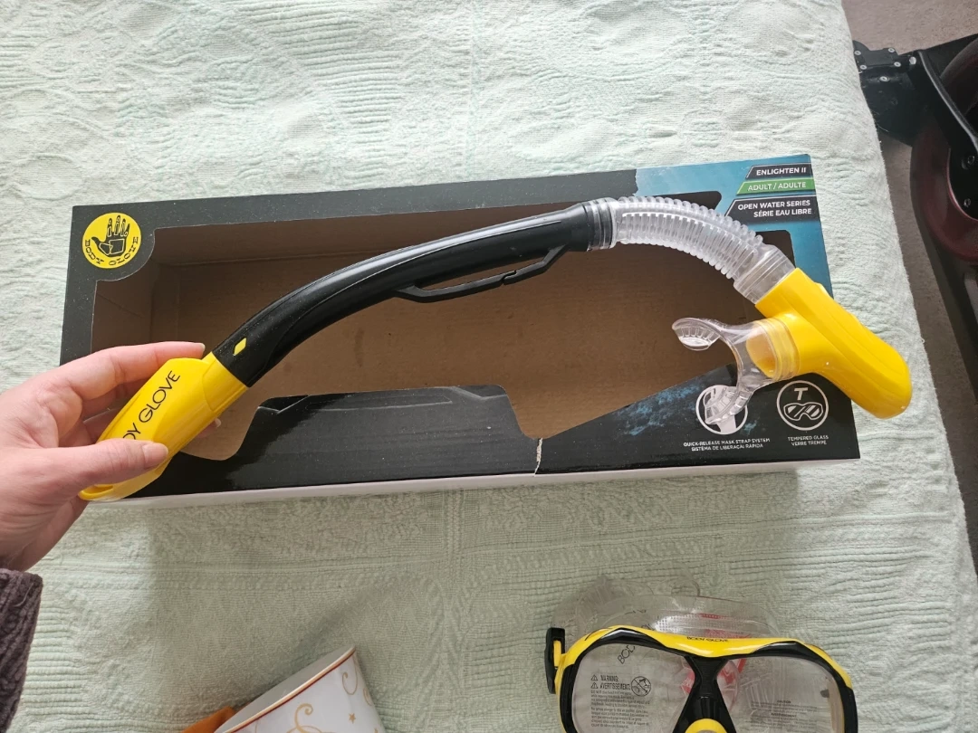 Adult snorkel mask and snorkel set from Body Glove. Tempered glass lens with a purge valve. Used once, glasses unused.