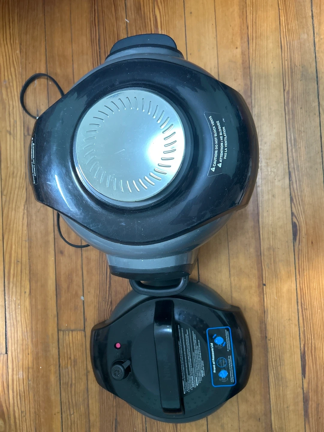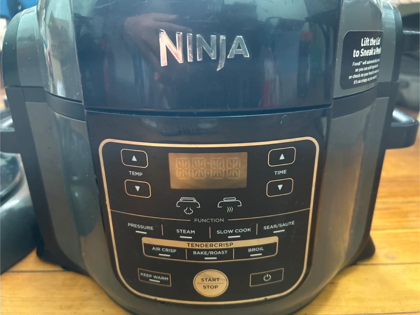 This is a Ninja Foodi multi-cooker with TenderCrisp technology. It offers pressure cooking, steam, slow cook, air crisp, bake/roast, broil, and keep warm functions. The unit has a digital display and control panel.