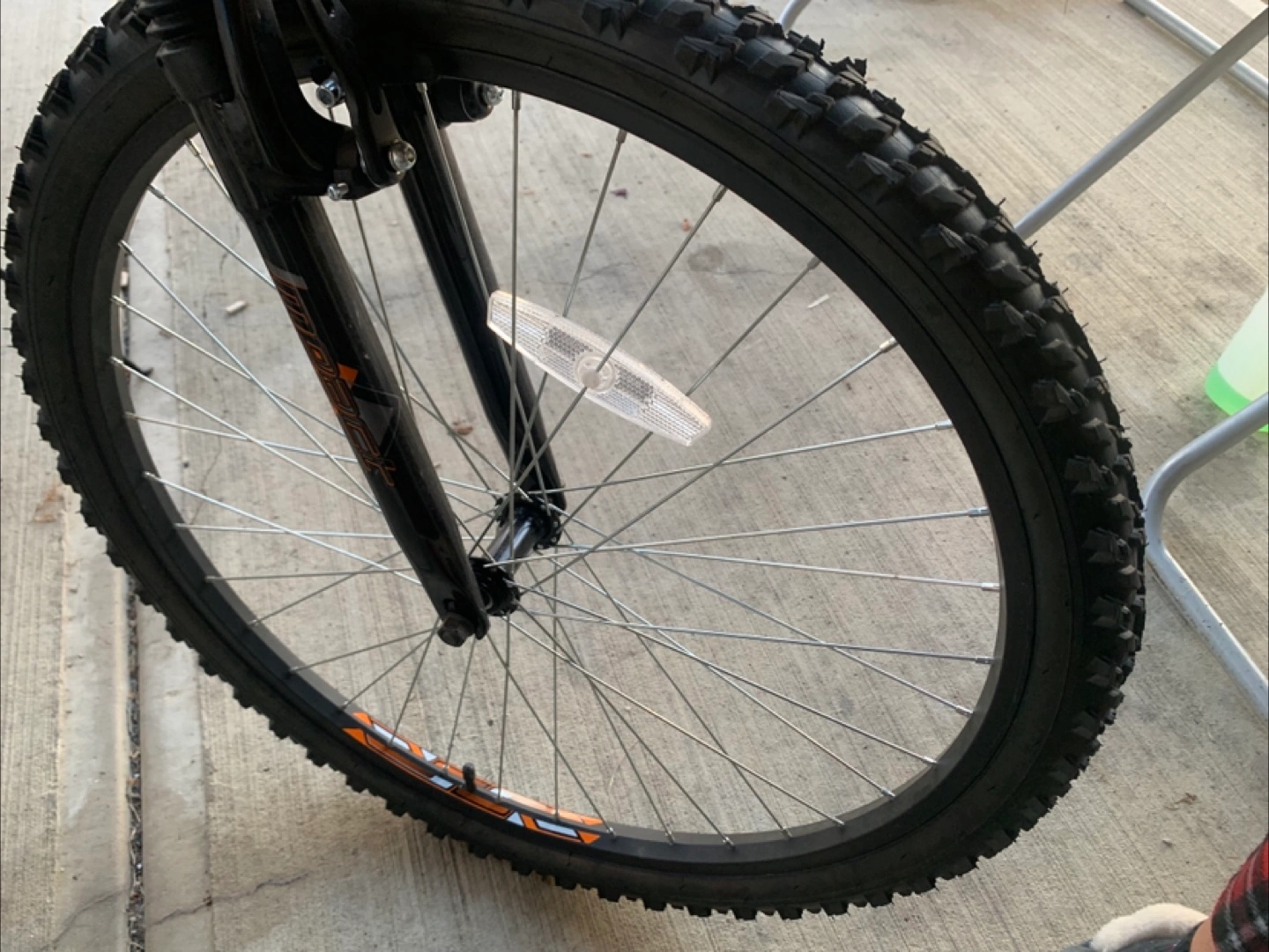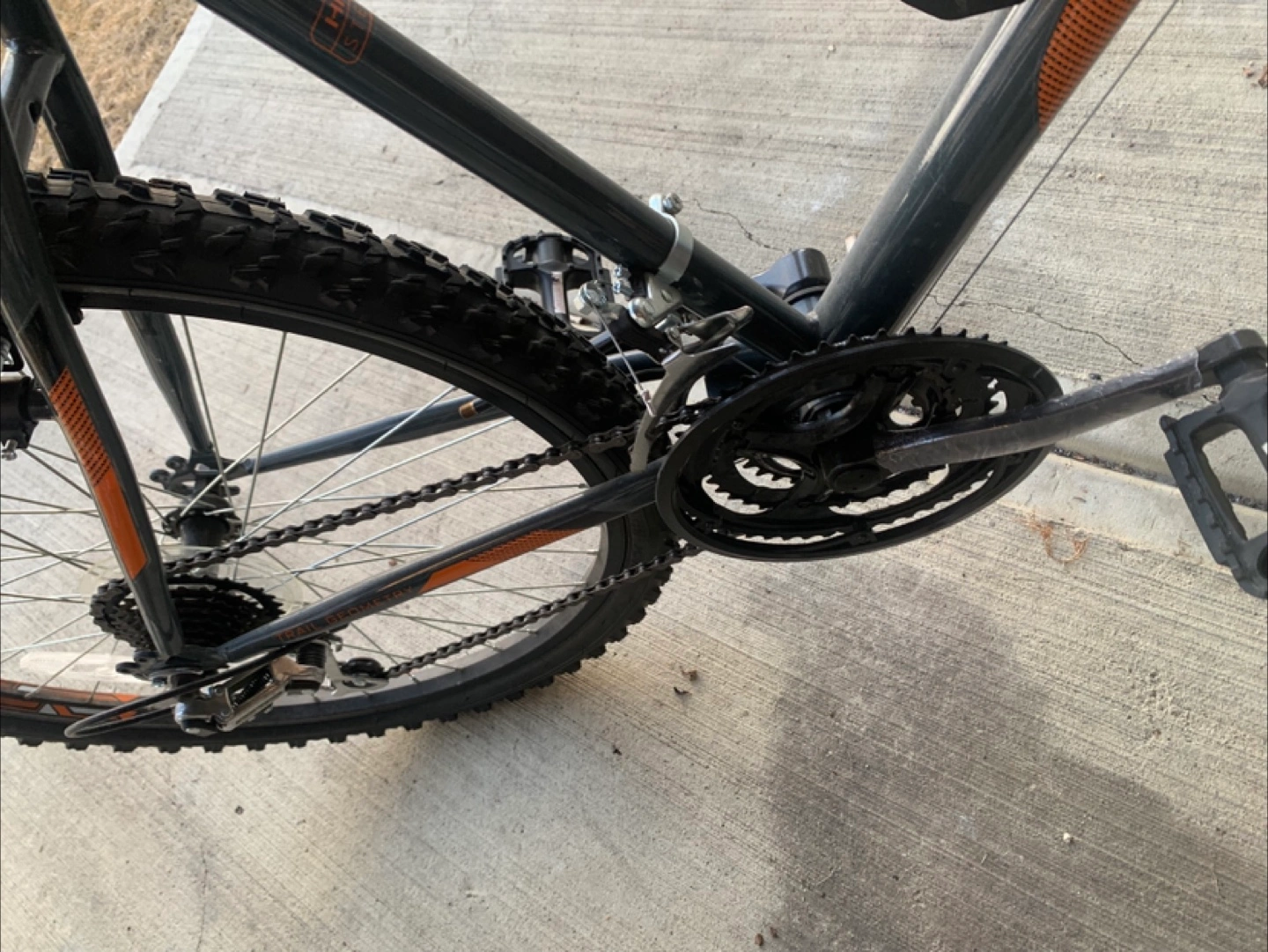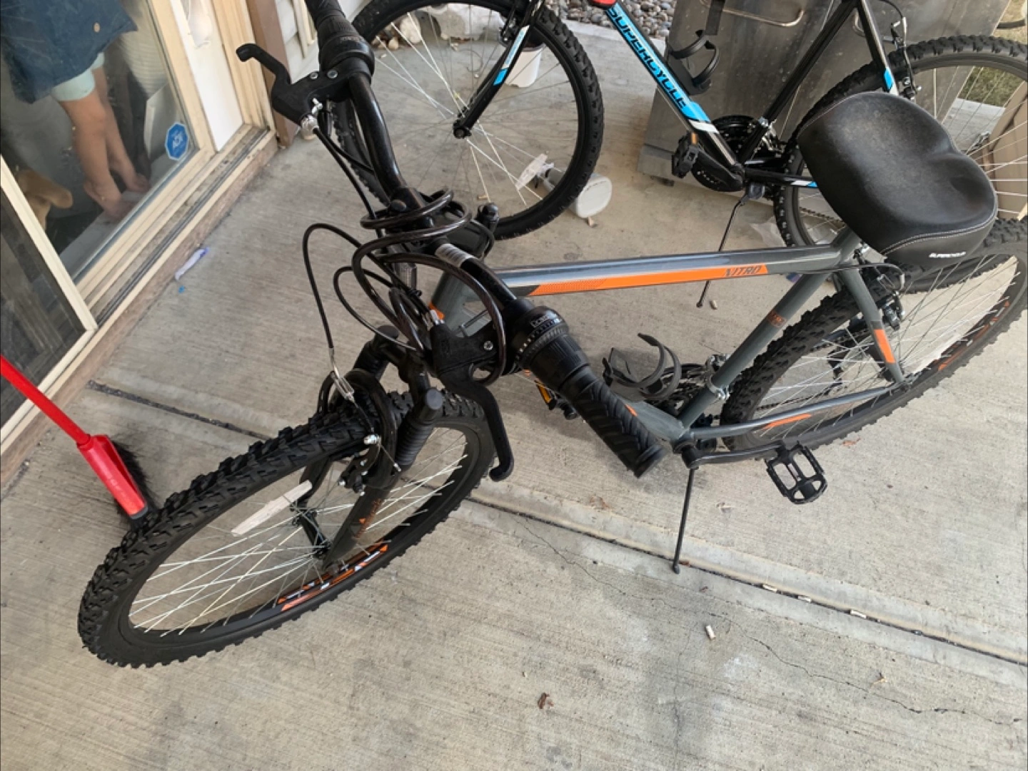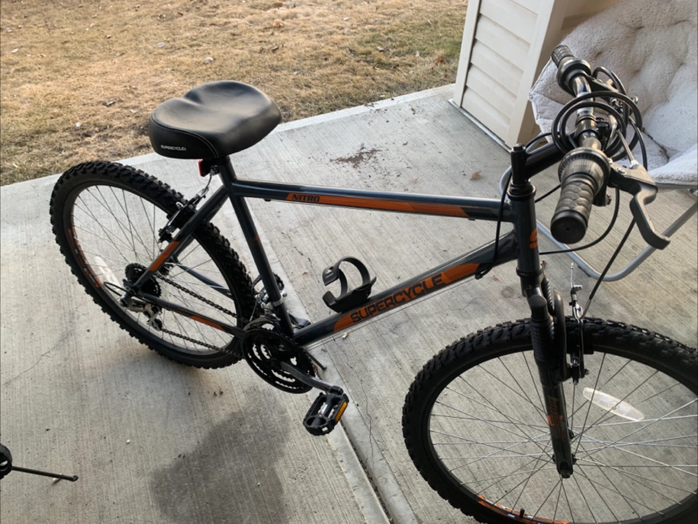 Grey and orange Supercycle Nitro mountain bike. It's a sturdy bike with knobby tires, perfect for trails or casual riding. It includes a water bottle cage. Brand new only rode a few times original seat included
