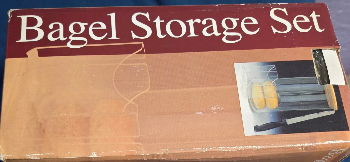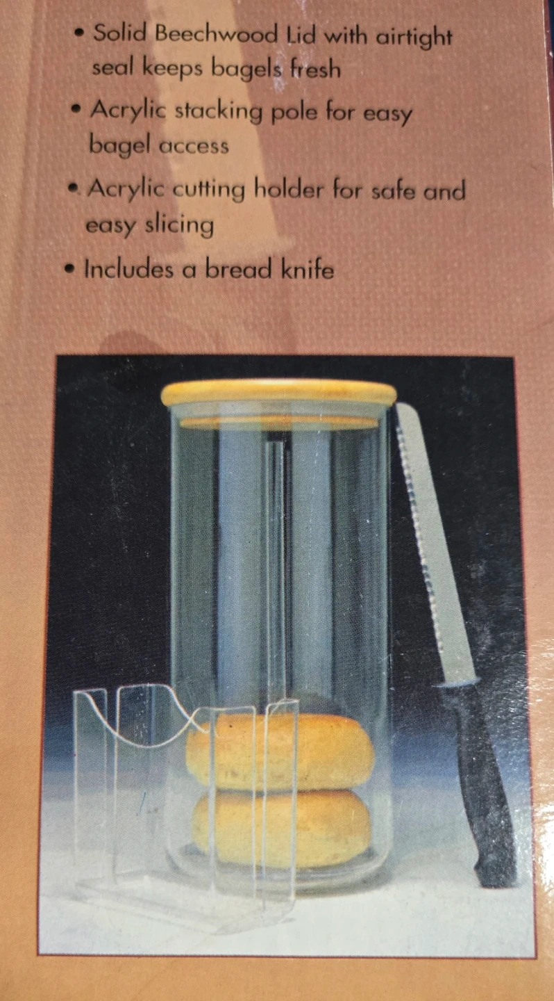 This bagel storage set features a solid Beechwood lid with an airtight seal that keeps bagels fresh. It includes an acrylic stacking pole for easy access and an acrylic cutting holder for safe slicing. A bread knife is also included!. Never been used