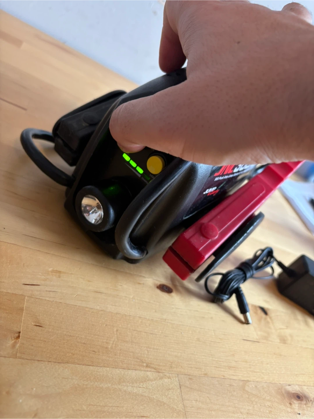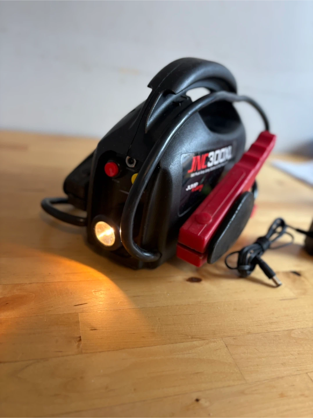 This JUMPCARAY JNC300XL is a 900 peak amp jump starter and 12-volt power source. It includes a built-in flashlight and comes with its charging adapter. The unit shows its charge level with indicator lights.