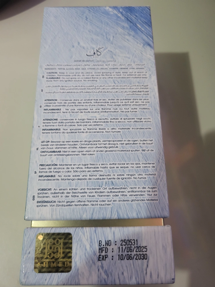 Selling a bottle of Kaaf Extract de Parfum. It comes in its original box and contains 100ml of fragrance. The expiry date is June 10, 2030