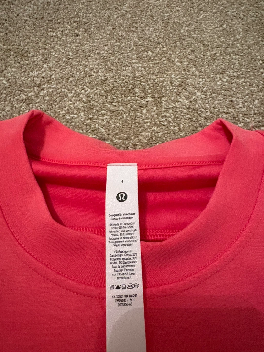 This is a Lululemon crew neck sweatshirt in a bright pink colour. It's made with a blend of polyester and nylon, with 38% recycled polyester. This pullover is perfect for casual wear or light workouts.