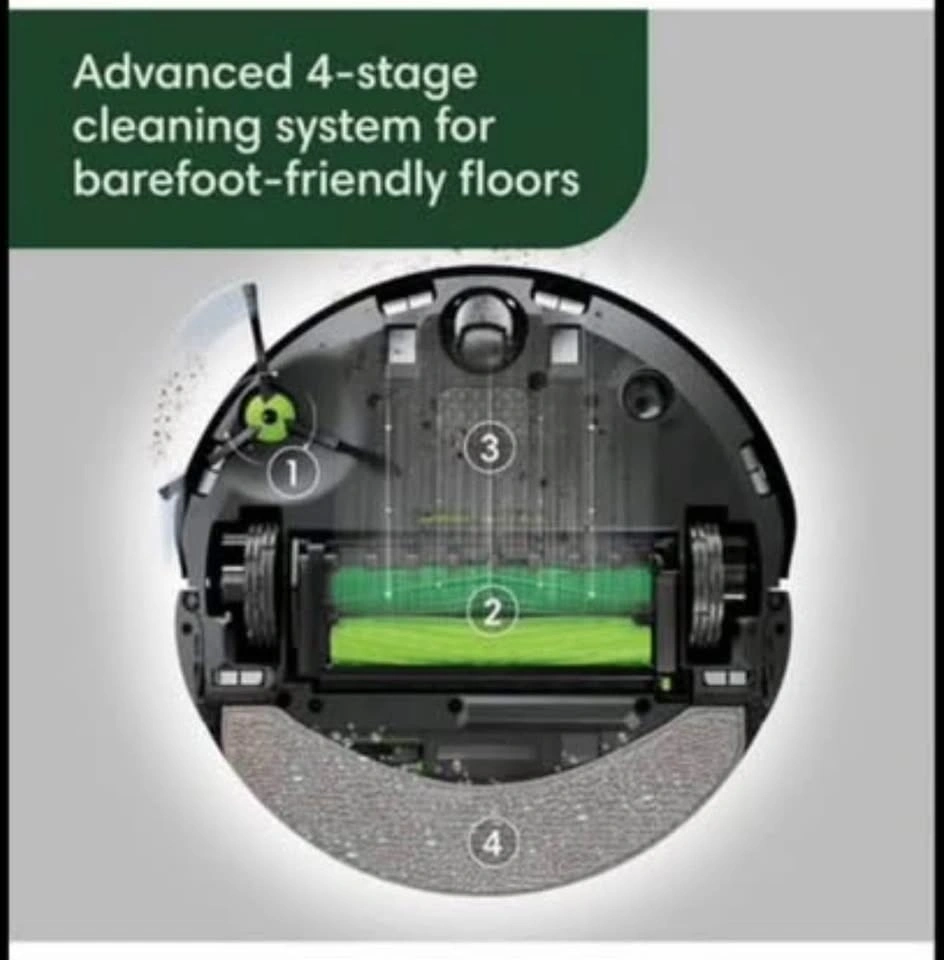 AN EXPERT IN DIRT ELIMINATION. The 4-Stage Cleaning System features an Edge-Sweeping Brush for thorough corner cleaning, Dual Rubber Brushes that avoid pet hair tangles, strong suction that easily pulls embedded dirt from carpets, and SmartScrub that mops back and forth with precision.