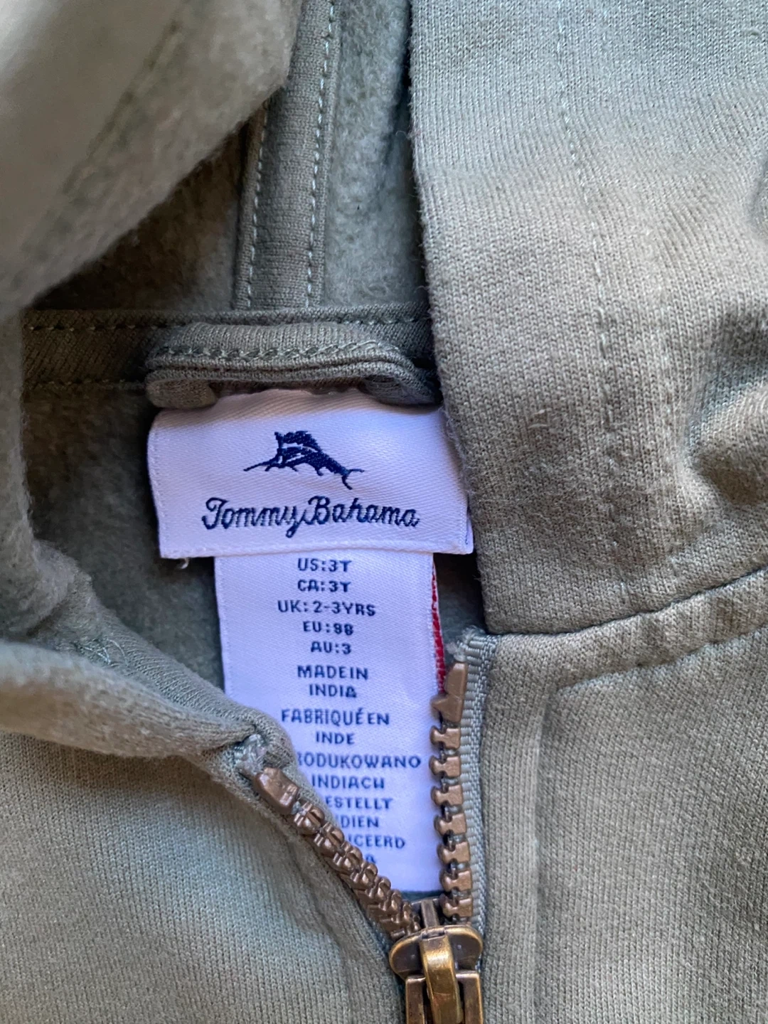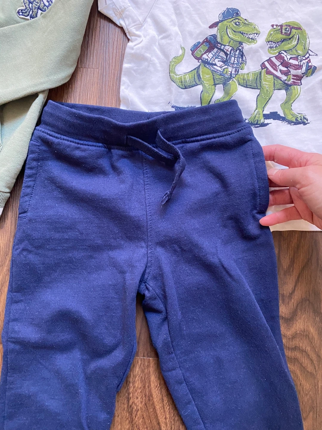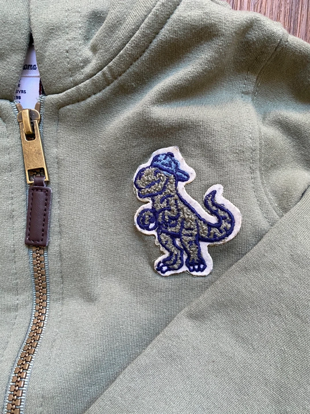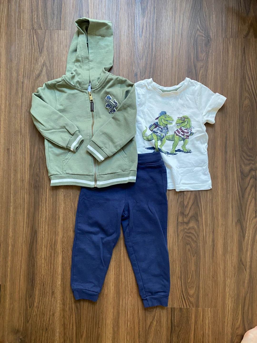 This cute dinosaur outfit includes a white t-shirt and a green zip-up hoodie with a dino patch. The set also comes with navy blue sweatpants. It's size 3T, perfect for toddlers who love dinos!