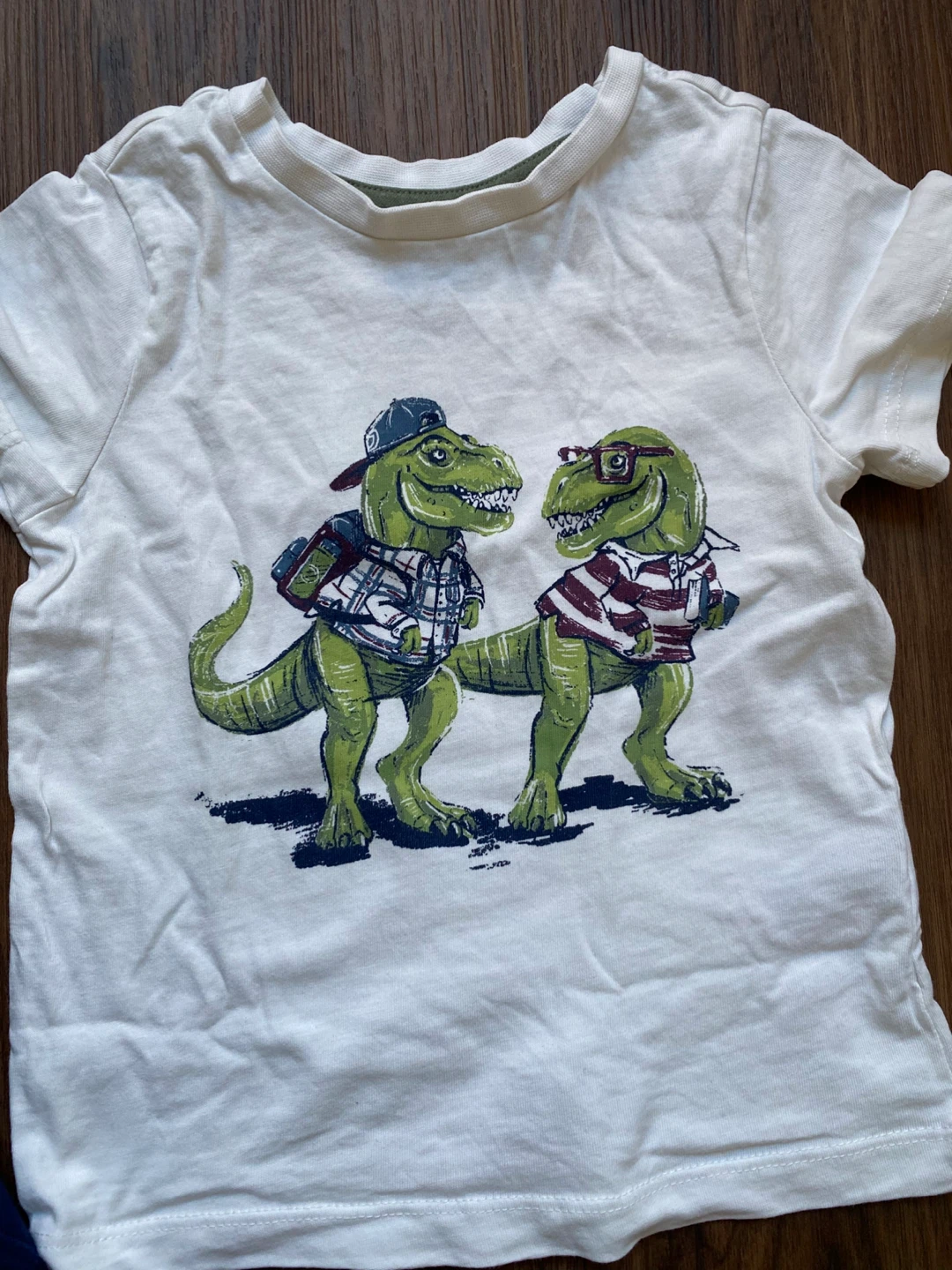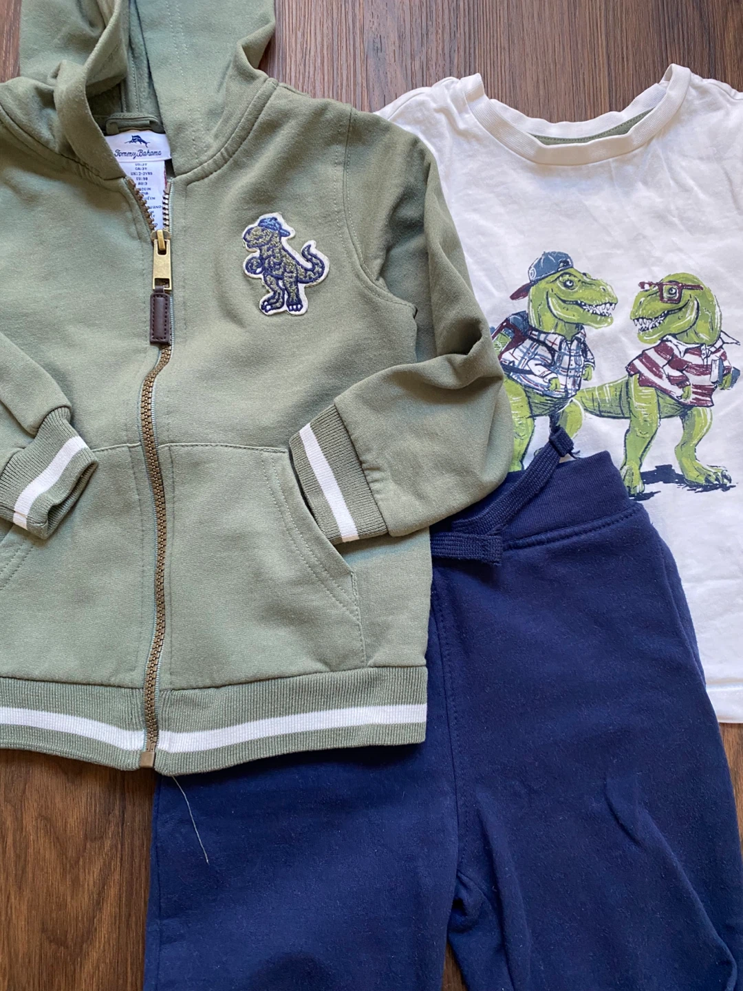 This cute dinosaur outfit includes a white t-shirt and a green zip-up hoodie with a dino patch. The set also comes with navy blue sweatpants. It's size 3T, perfect for toddlers who love dinos!