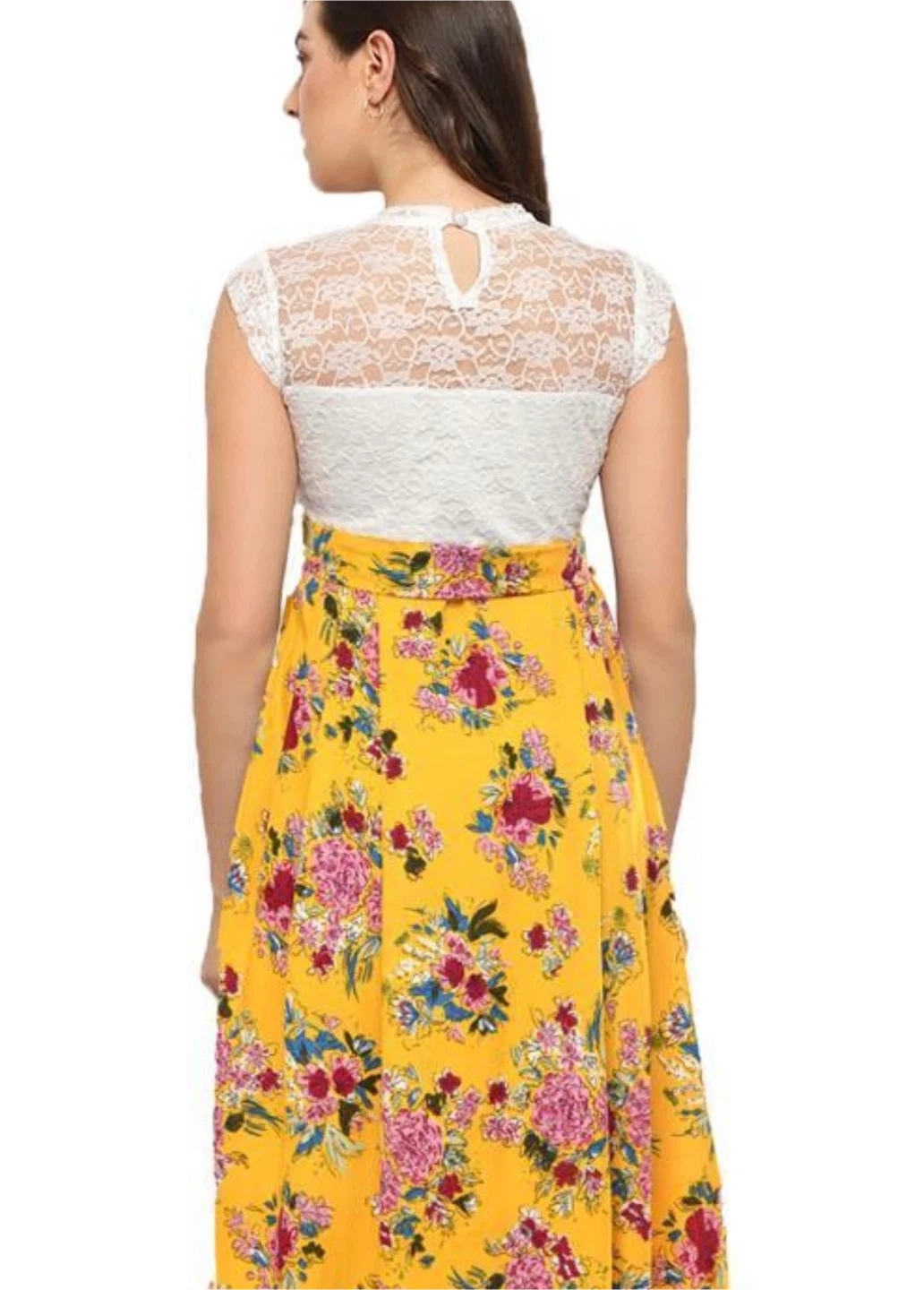 This is a flowy midi skirt with a vibrant yellow base and a colourful floral print. It features a tie waist and a pleated design. A lovely skirt for warmer days!