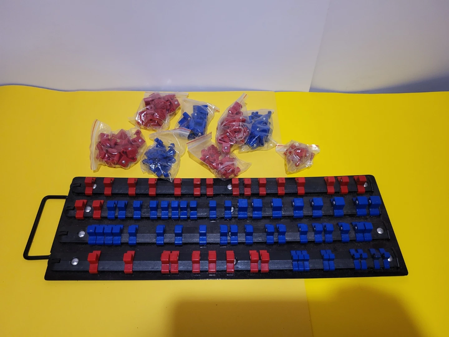 Socket Organizer Rack Tool with Red and Blue Clips