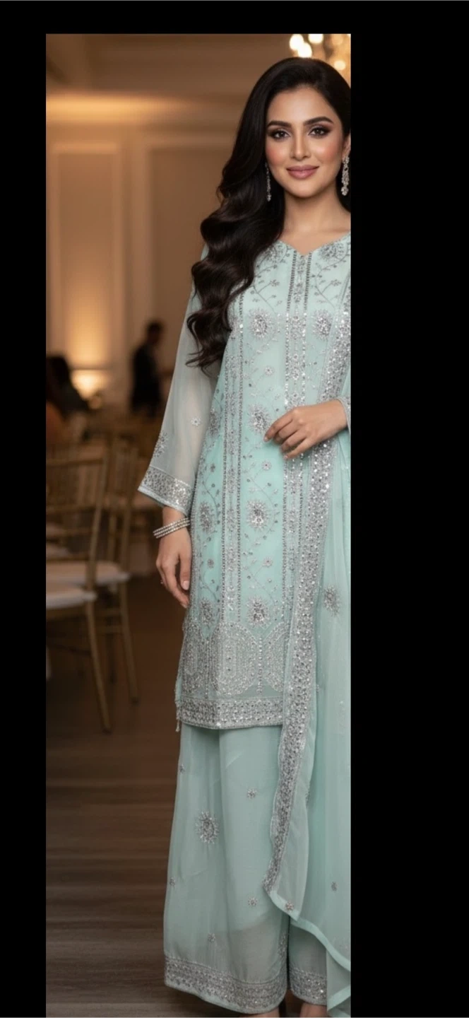 Discover the elegance of our sea green with silver zari and sequence chiffon dress, perfect for parties, weddings, or any formal events. Fabric: Chiffon. Shoulders: 15". Chest: 21". Hips: 22". Shirt length: 36". Sleeves length: 19". Palazzo length: 38". Color: Sea green. We never sell worn clothes. Pickup near 126 and 72 Ave Surrey BC.