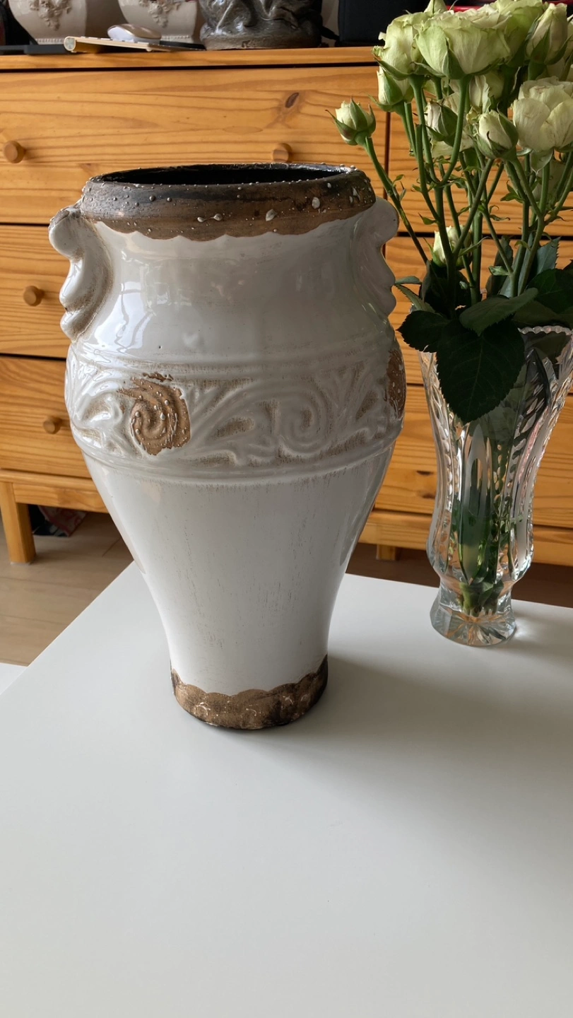 White ceramic vase with brown accents. Has two handles. The bottom of the vase has four small, black rubber feet.