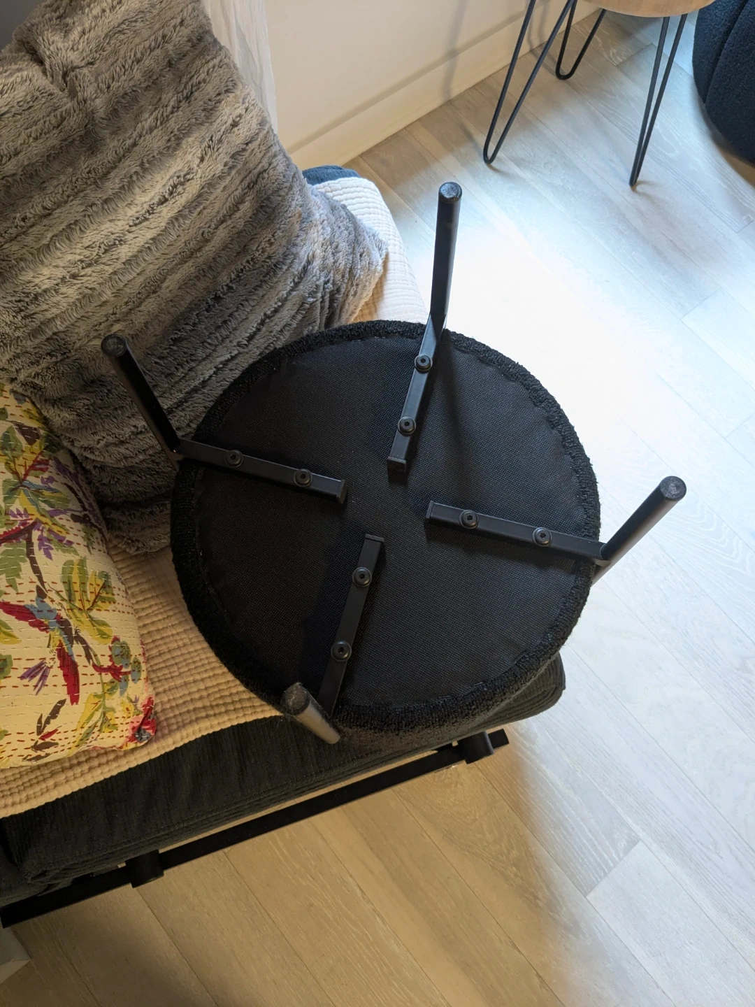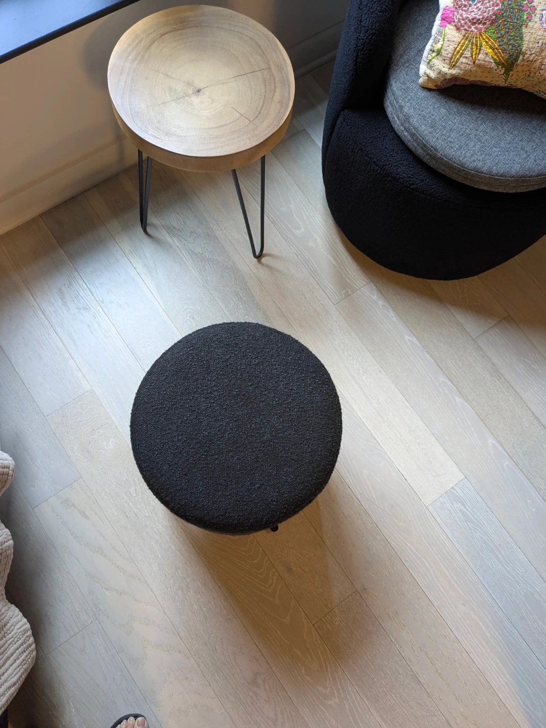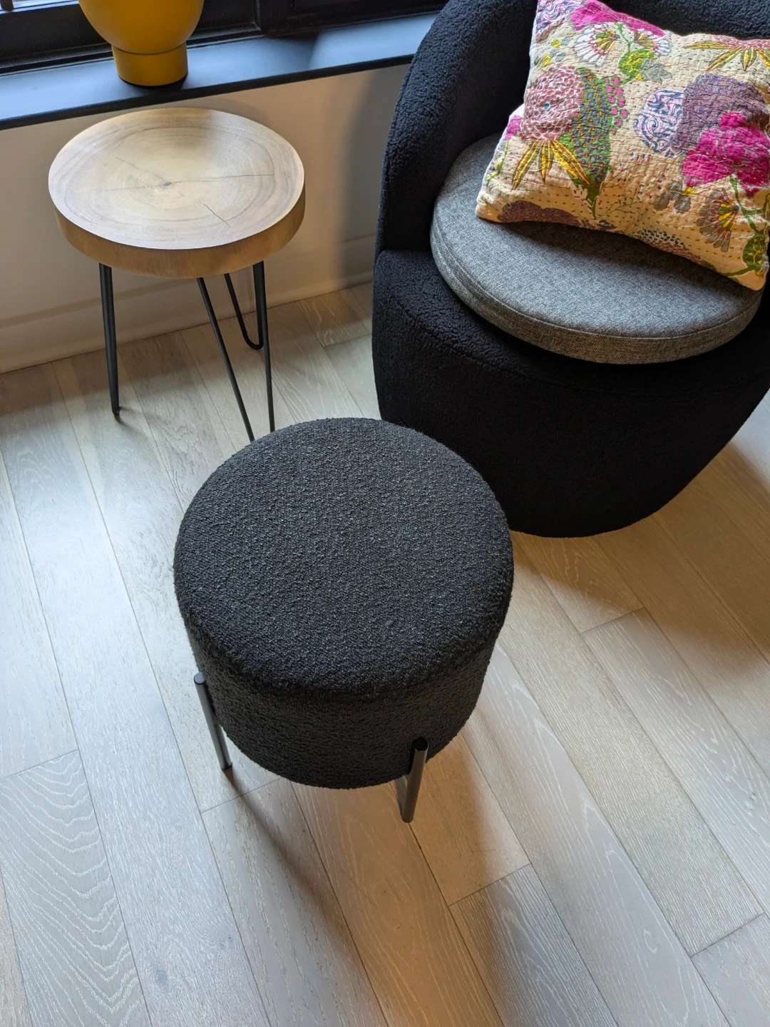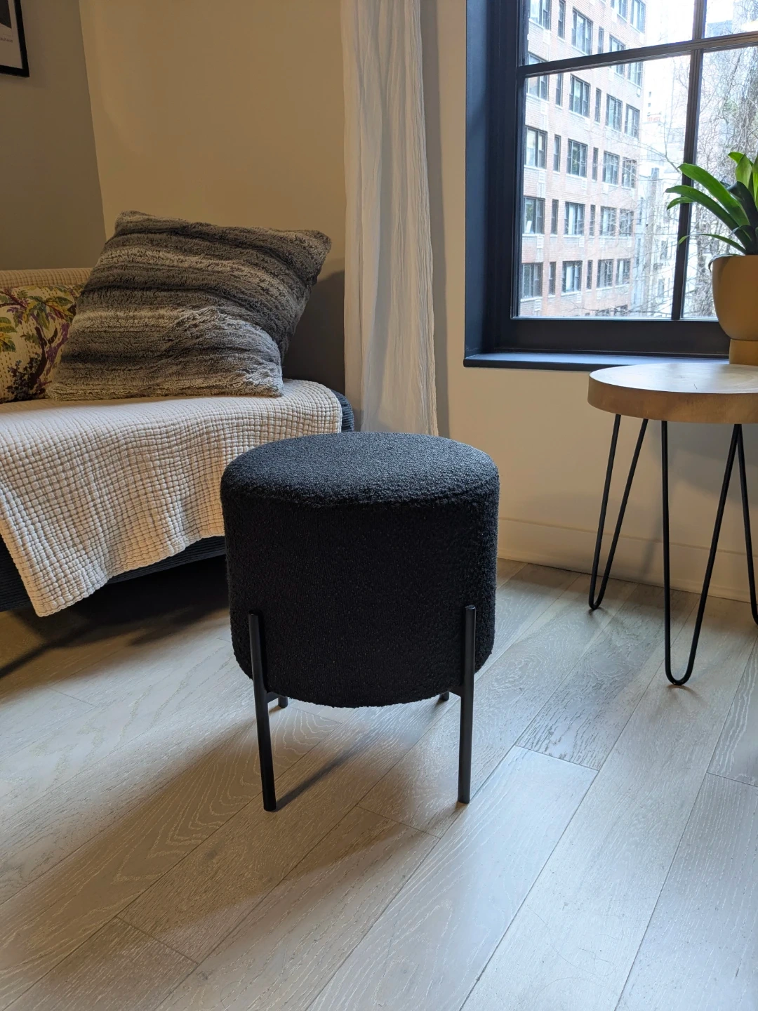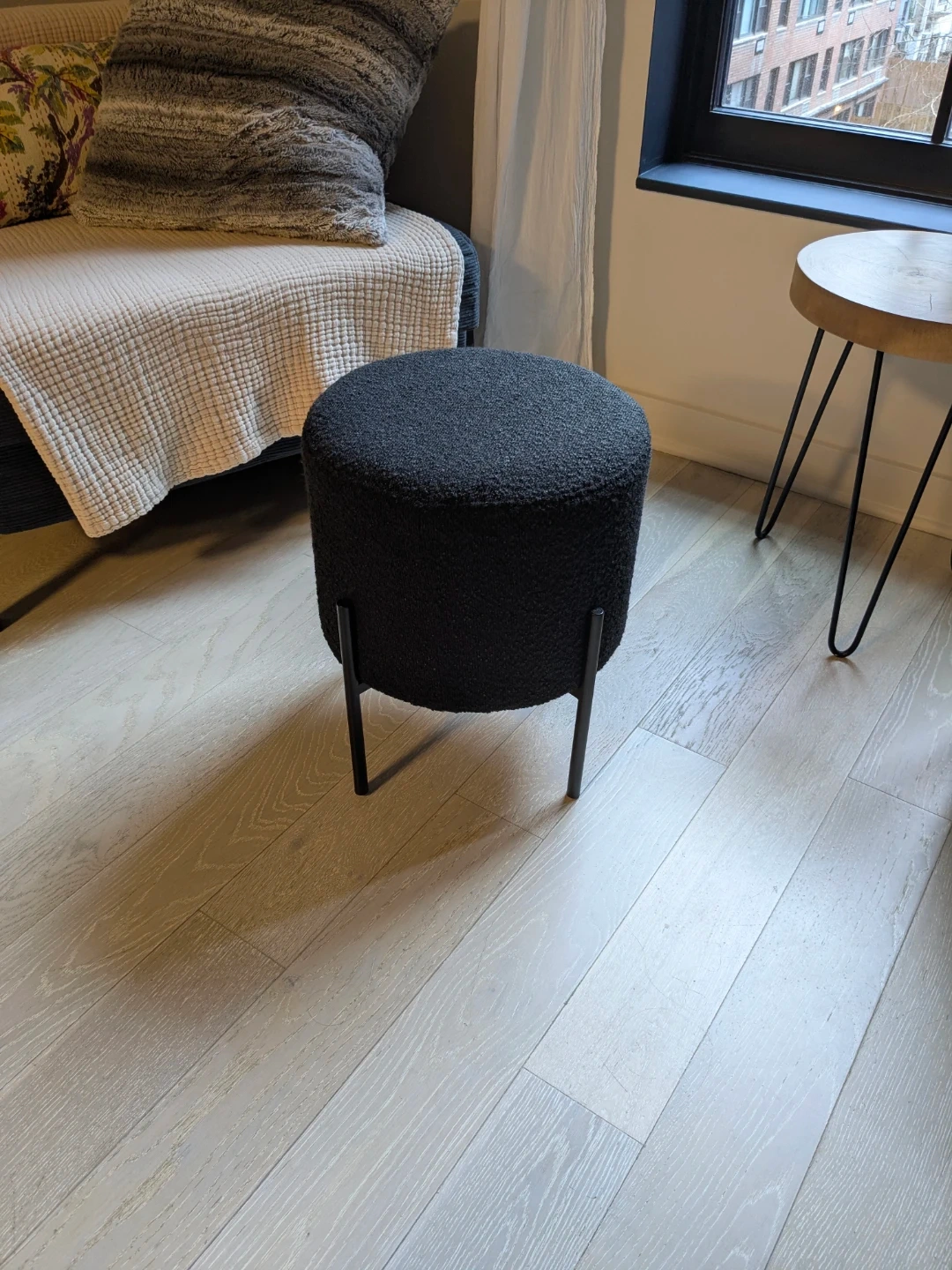 Like new - spotless. It's upholstered in a boucle fabric with metal legs. This stool is perfect for the entrance or bedroom.