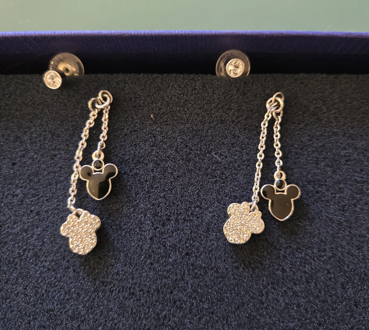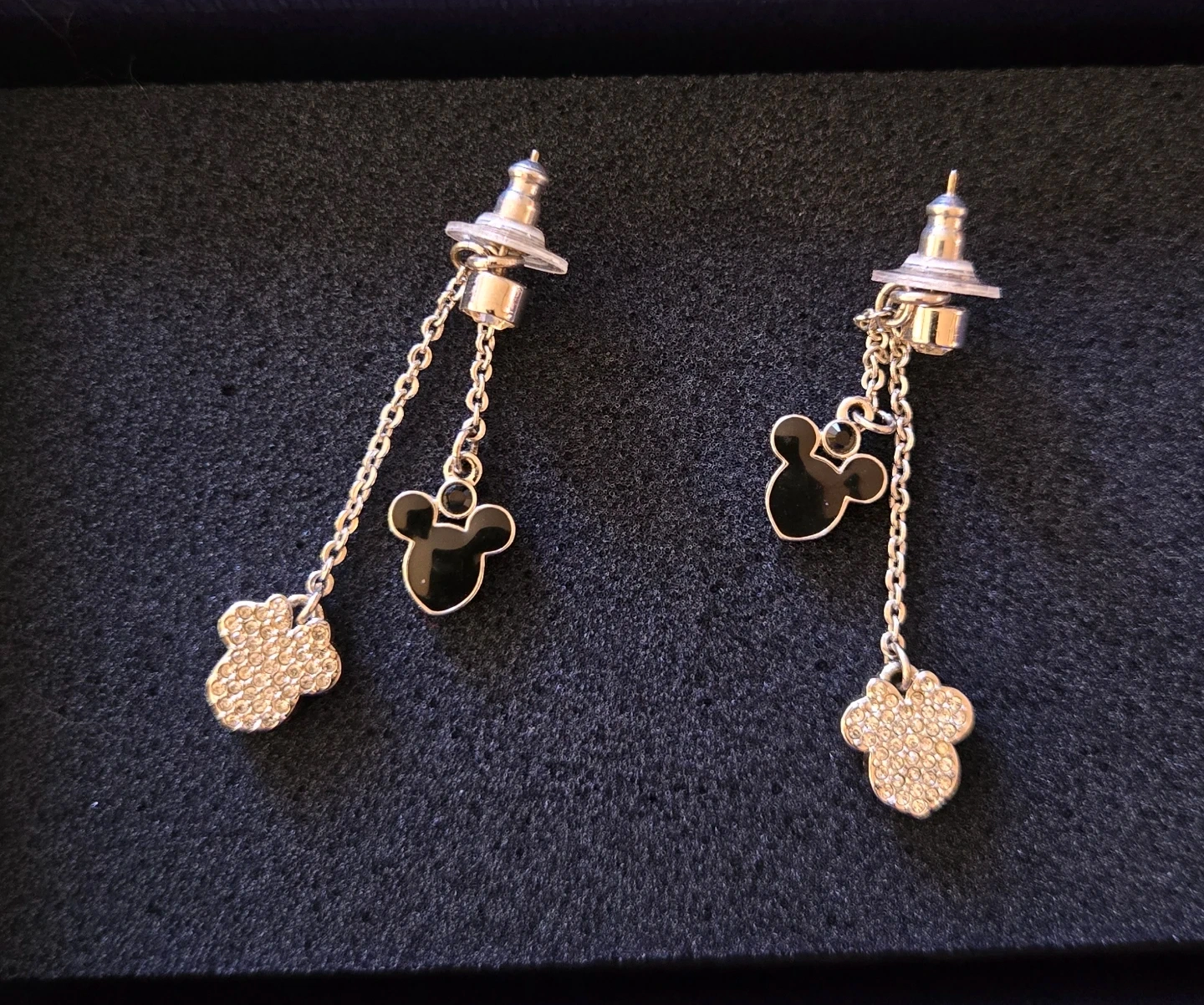 Sparkly Mickey Mouse dangle earrings. Features two sets of charms on each earring, one black enamel Mickey head and a crystal Minnie head.