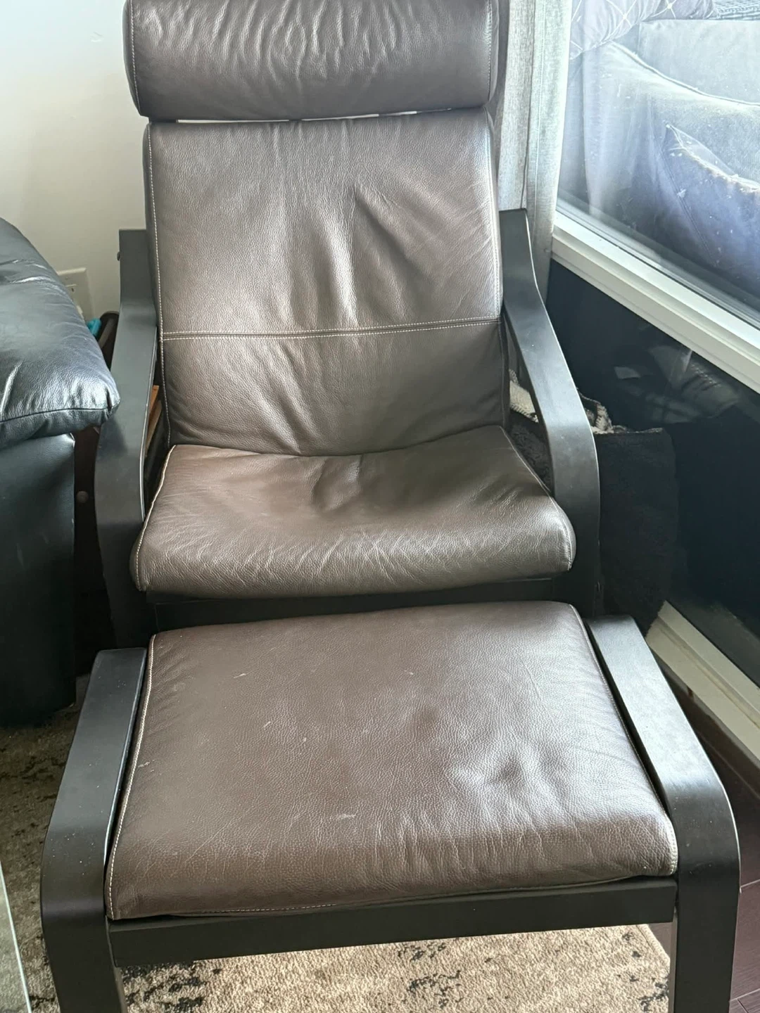 Selling a comfy IKEA Poang chair with matching footstool. The chair is in good condition and perfect for relaxing after a long day. The brown leather gives it a classic look that fits well in any living room. It's a great addition to any home!