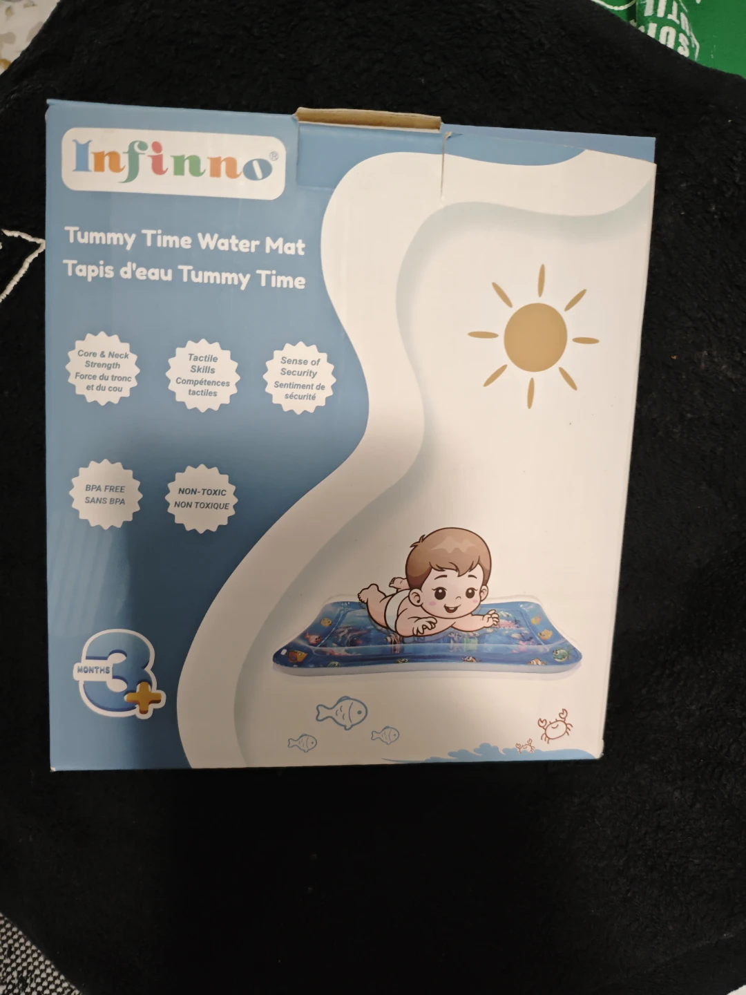 This is an Infinno Tummy Time Water Mat. It's BPA-free and non-toxic. It helps develop core and neck strength. Suitable for ages 3 months and up!