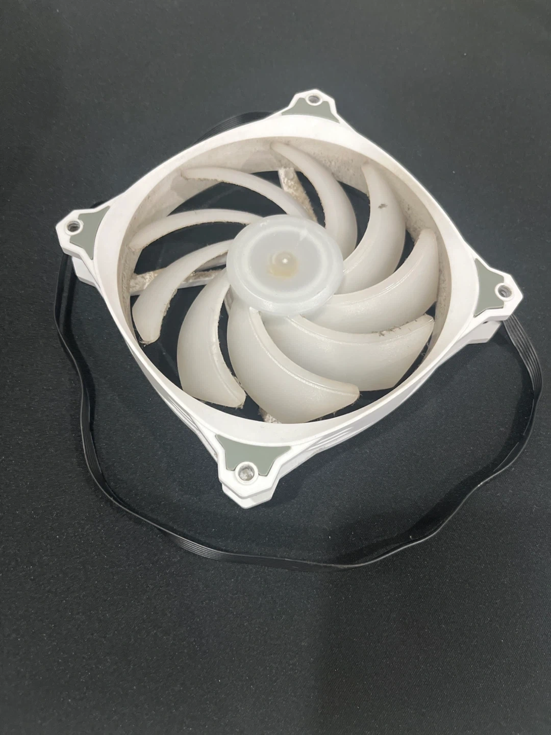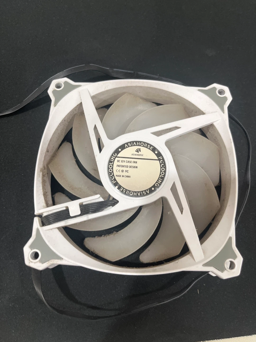 This is an Asiahorse DC 12V case fan. It's a patented design made for PC cooling. The fan is white with grey accents. Measures 120mm.
