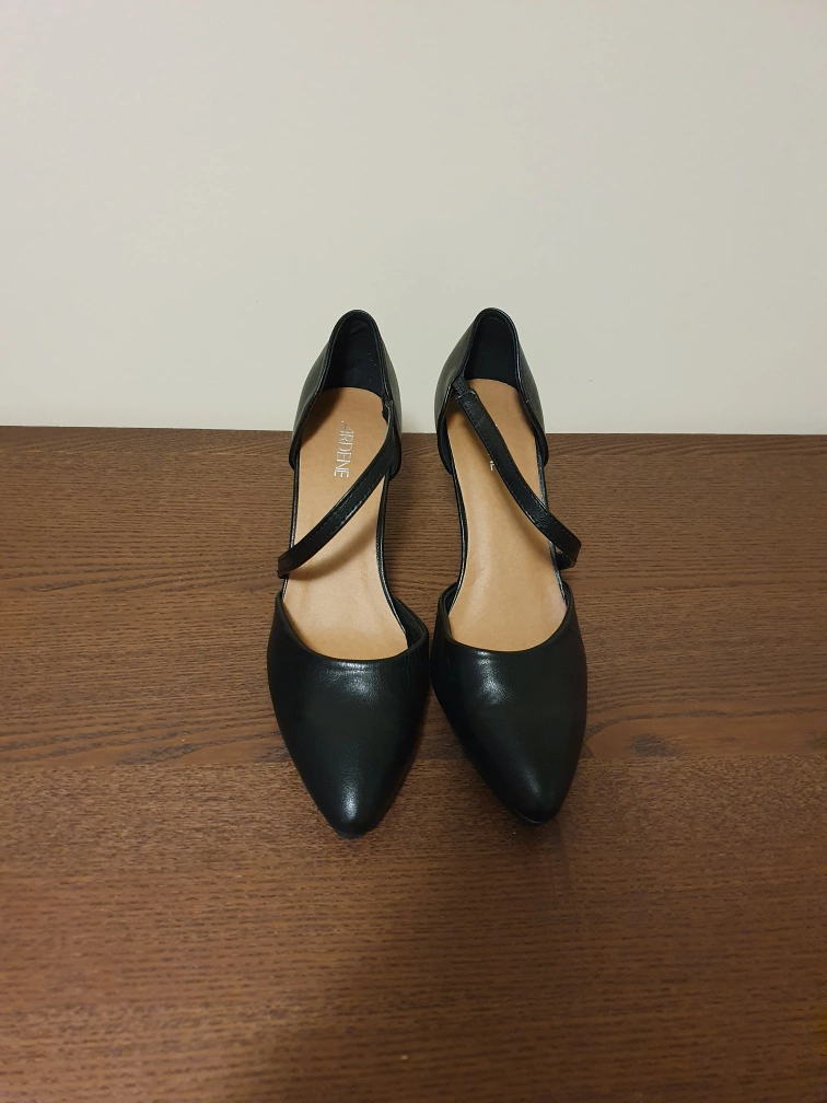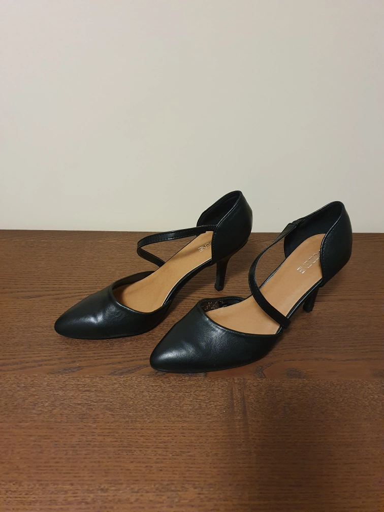 Stylish black heels. Pointed toe, cross strap detail. Low heel. Great for work or a night out.